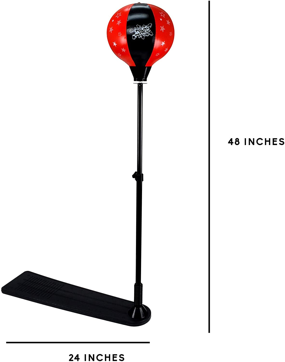Jimmy’s Toys Kids Inflatable Boxing Punching Bag Sports Equipment – Kids Boxing Set is a great way to help increase agility, hand-eye coordination, and overall fitness while having fun. It will also relieve your child’s stress and tension. The large standing non-slip base is perfectly designed for the size of your child to stand on, and with his own weight, the boxing ball is safe and stable without the need to apply sand or water. Advanced spring-mounted metal stand for great stability, flexibility and strength. Padded gloves and a ball pump come included. Adult assembly may be required.