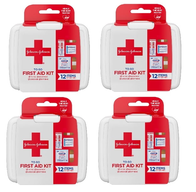 Be prepared while you’re on the go with this Johnson & Johnson First Aid to Go! travel emergency first aid kit. Available in a durable plastic case, it contains 12 essential first aid items and wound care supplies and is the perfect mini size to carry in a purse, backpack, gym bag, car or luggage. This portable mini first aid kit contains two 5-by-7.75-inch Johnson & Johnson Hand Cleansing Wipes, four 2-by-2-inch Band-Aid Brand Gauze Pads, two.75-by-3-inch Band-Aid Brand Flexible Fabric Adhesive Bandages, and four.63-by-2.25-inch Band-Aid Brand Flexible Fabric Adhesive Bandages. It’s ideal for travel, camping trips, vacations, sporting events, or to keep on hand in the car.Johnson & Johnson Mini First Aid Kit Essential Emergency Travel Kit with 12 first-aid suppliesAvailable in a durable plastic case, this portable mini kit contains 12 essential first aid itemsIts compact size is perfect to carry in a purse, backpack, gym bag or luggage for on-the-go useEmergency set contains two 5-by-7.75-inch Johnson & Johnson Hand Cleansing WipesContains four 2-by-2-inch Band-Aid Brand Sterile Gauze PadsTravel first aid kit contains two .75-by-3-inch Band-Aid Brand Flexible Fabric Adhesive BandagesContains four .63-by-2.25-inch Band-Aid Brand Flexible Fabric Adhesive BandagesSome items in this portable kit contain natural rubber latex, which may cause allergic reactionsIndications:Johnson & Johnson First Aid To Go Portable Mini Travel Kit, 12 pieces ( pack of 4)
