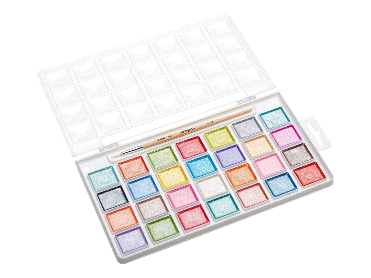KINGART Watercolor Half-Pan Set, Pearlescent Colors, 28 Unique Shades & Paint Brush
