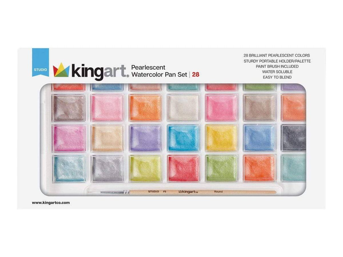 KINGART® Watercolor Pan Set, Pearlescent Colors, 28 Unique Shades Paint Brush Create beautiful works of art with these pearlescent watercolor paints. The collection is comprised of a variety of water-soluble, brilliant colors. They’re perfect for students, teachers, and anyone else interested in painting with watercolors. Add fun colors and subtle hues to your canvas wall art with this watercolor set from KINGART®. With 28-shades neatly encased in a portable case, this set of colors is easy to carry when on the go. Its sturdy hinged lid also doubles up as a mixing palette to create unique shades for your artwork. They are absolutely gorgeous! This collection will brighten up your projects and leave a smile on your face. Paints cover paper effortlessly for pearlescent. Long-lasting vibrancy. Great for painting, stamping, greeting cards, and much more. They will add dimension and sparkle to all your paper crafts. Excellent color saturation shimmer. Can be used with a water-pen rather as well as paint brush can be used alone or with other watercolors/water based media. Total Piece Count is 30 – 28 cakes, 1 brush 1 case. Non-toxic conforms to ASTM D4236.The KINGART® HeritageOur family has been exceeding the needs of the most demanding artists and enthusiasts for three generations. We delight in challenging the status quo and putting our experience to work for you.KINGART® 28 PEARLESCENT WATERCOLOR PAINT SET