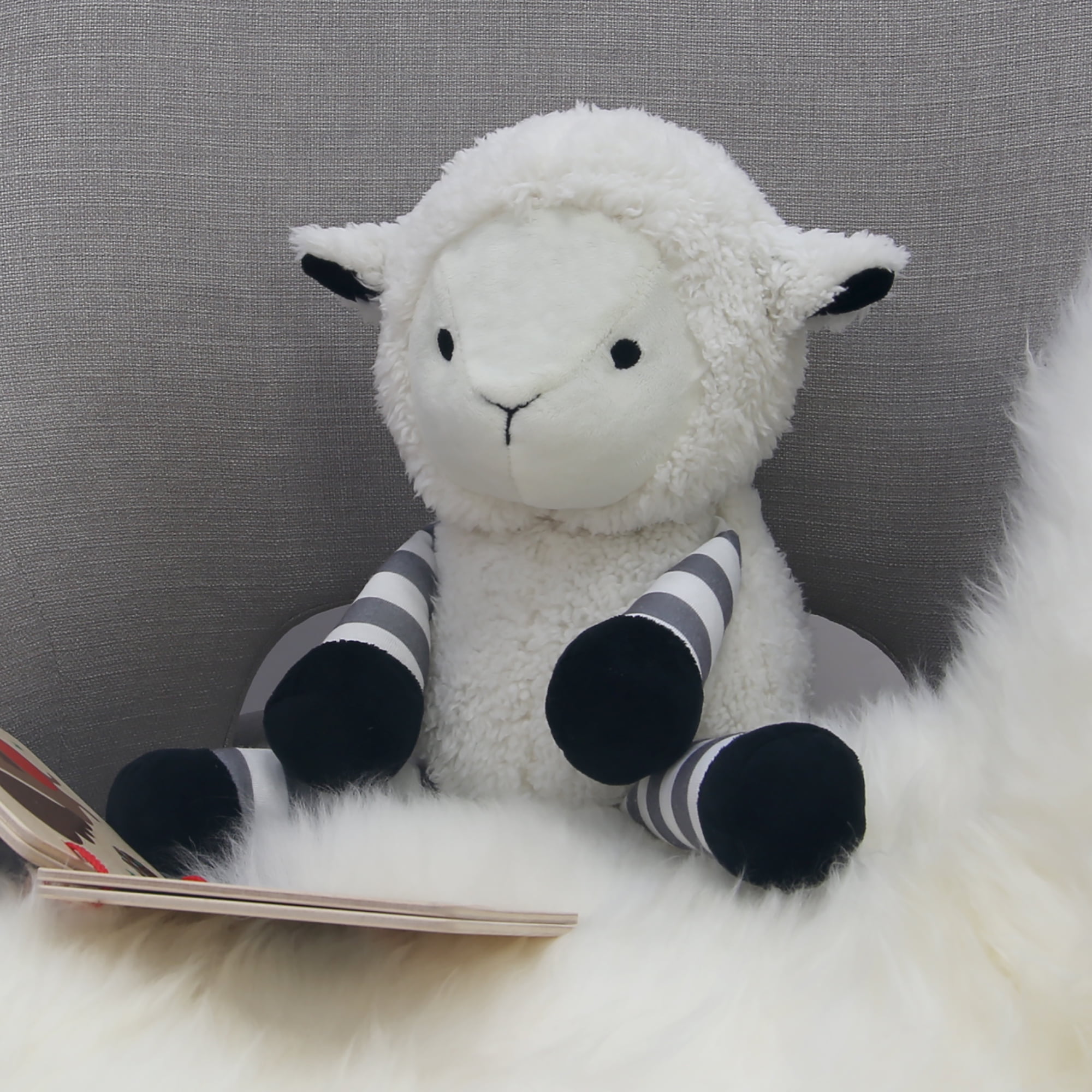- Baby lamb has striped legs and a super soft Sherpa body