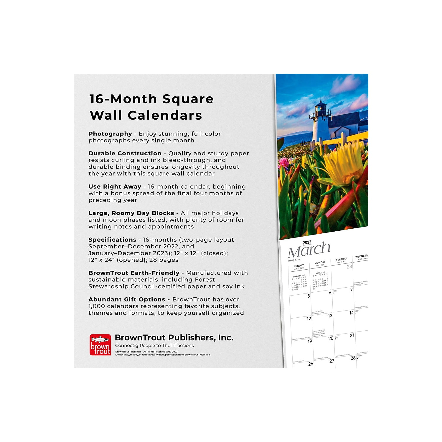- Specifications – 16-months (two-page layout September–December 2022, and January–December 2023); 12" x 12" (closed); 12" x 24" (opened); 28 pages