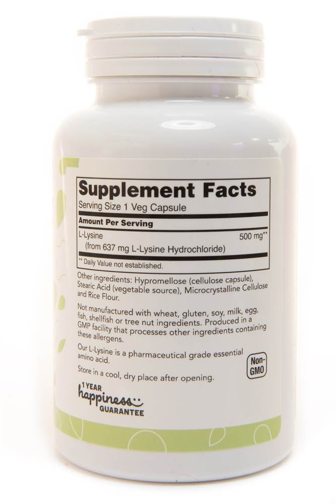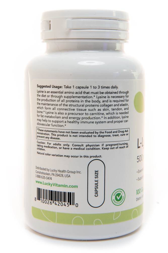 LuckyVitamin – L-Lysine 500 mg. – 100 Veg Capsules Lysine is an essential amino acid that must be obtained through the diet or through supplementation. Lysine is necessary for the production of all proteins in the body, and is required for the maintenance of the structural protein collagen and elastin, which form all connective tissue such as skin, tendon, and bone. lysine is also a precursor to carnitine, which is needed for fat metabolism and energy production.LuckyVitamin – L-Lysine 500 mg. – 100 Veg Capsules