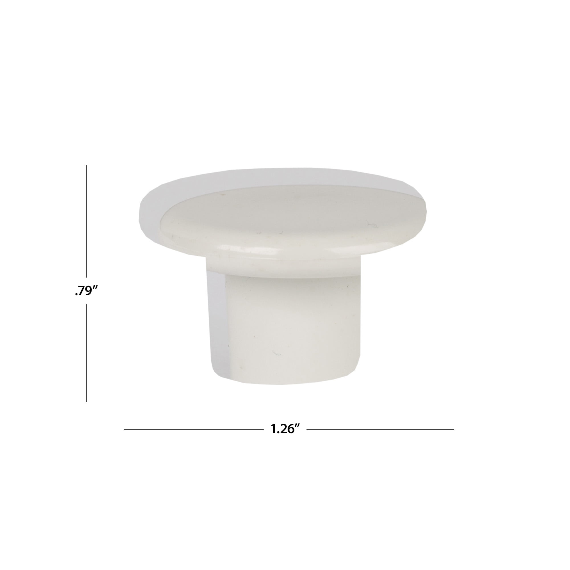 The Mainstays Classic Cabinet Knob comes in a soft, matte white finish. The simple, minimalist design of the modern knob is perfect for any cabinet drawer or door. It’s an easy to install, affordable knob for a missing or broken piece of cabinet hardware in the utility room, garage, kitchen or bathroom. The classic white finish has a clean look and blends seamlessly in many areas. This knob measures 1-1/4 inches (32mm) in diameter and has a durable plastic construction. The package includes (2) cabinet knobs and (2) 8-32 x 1 inch mounting screws for a quick, stress free installation. Product dimensions are 1.25 in. L x . 1.25 in. W x .79 in. H.