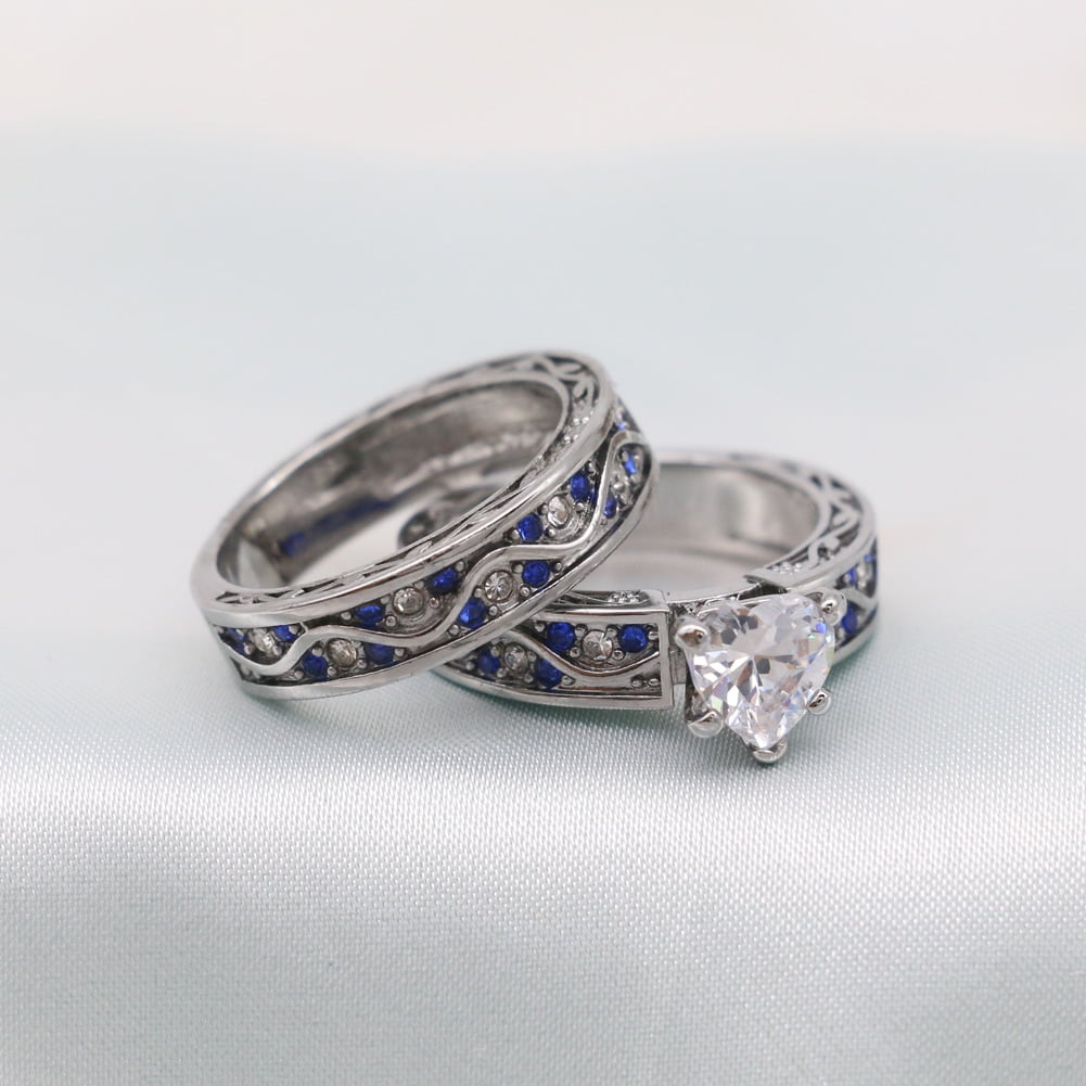 - HIGH-QUALITY couple rings:women’s Ring is 2pcs white gold plated heart aaa cz wedding Ring sets engagement ring.Mne’s ring is blue plated 8mm wide tungsten mens wedding band,wear resistant, anti-collision.
