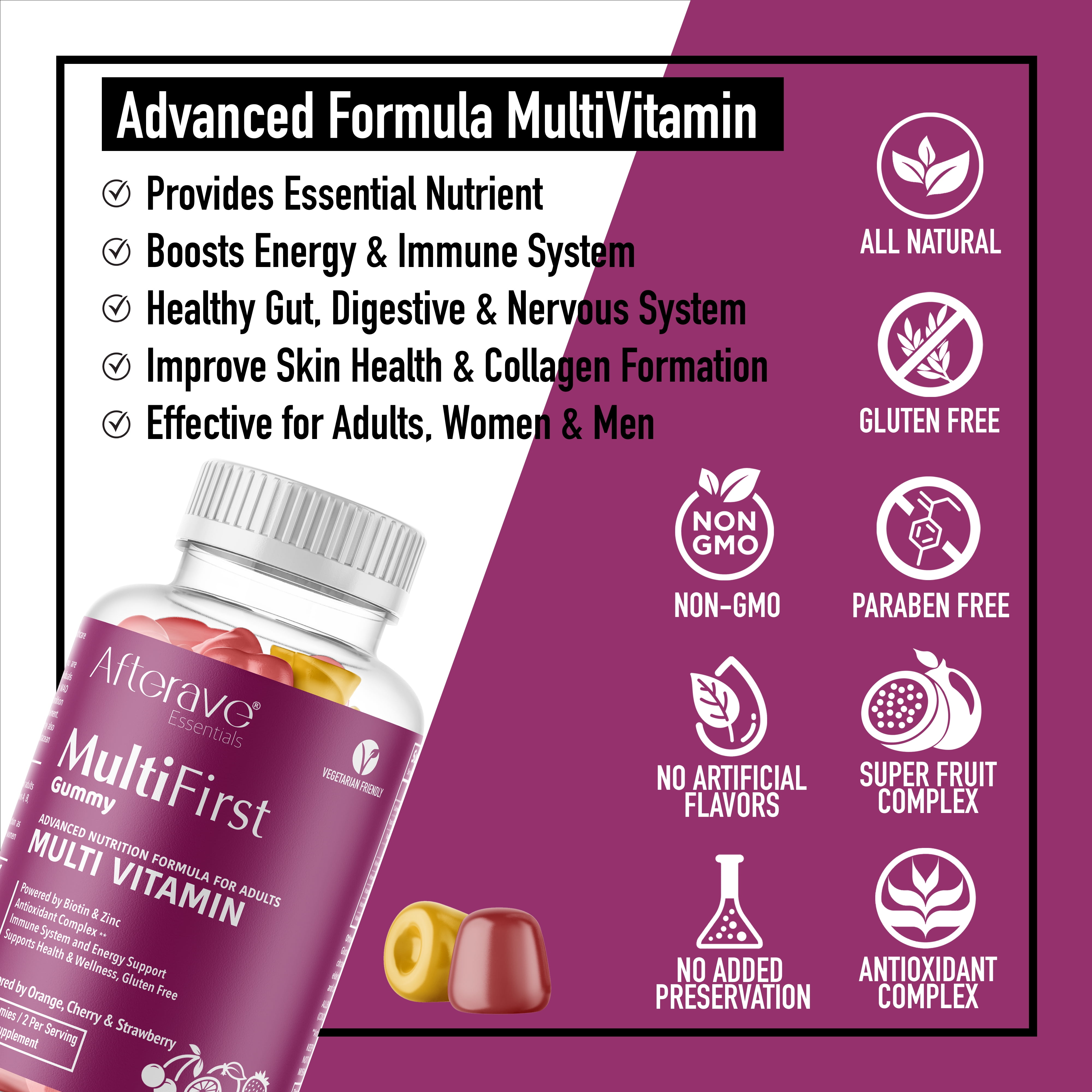 MultiFirst Advanced Formula MultiVitamin Gummy by Afterave Essentials, Promotes Energy, Healthy Digestive & Immune System, Antioxidant Vitamin A, C, D, E, B Complex, Zinc, Enhanced Collagen Formation
