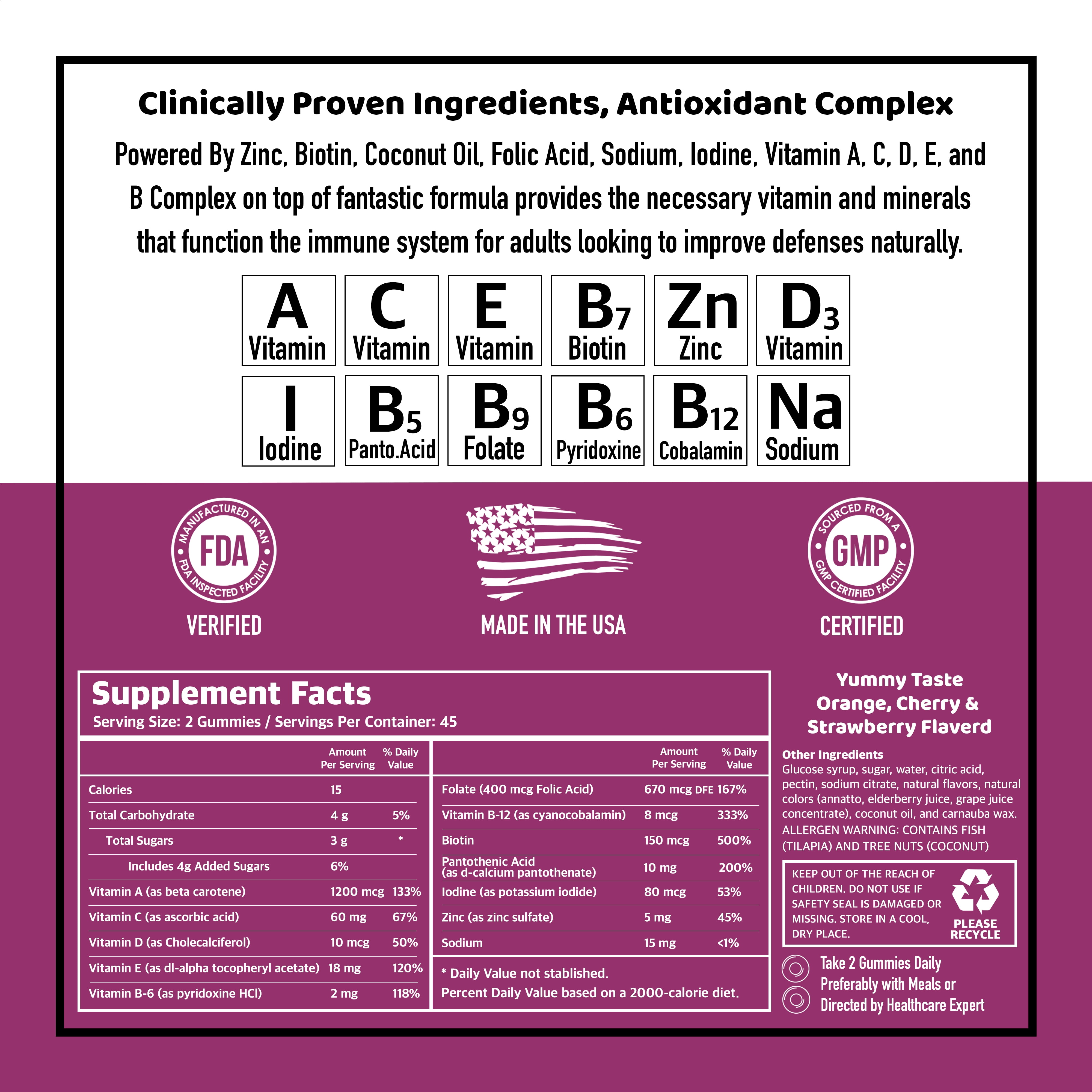 ENHANCE IMMUNITY: Our potent multivitamin for adults provides essential nutrients to function energy and immune system, healthy heart, digestive & nervous system, and enhanced collagen formation. SUPER-FRUIT INGREDIENTS: Antioxidant complex with vitamins powered by Vitamin A, C, D, E, Zinc, B Complex as Biotin, Pantothenic Acid, B6, B12, Sodium, Iodine, and Folic Acid. All-natural blends flavored by Orange, Cherry & Strawberry, Enriched with Grape, Pectin, Citric Acid, Elderberry & Coconut Oil Concentrate. PURE QUALITY WITH OPTIMAL RESULTS: Our mission is to help the world’s community have a healthier life. MultiFirst is a USA-made product in an FDA and GMP-certified facility. Scientifically formulated and Lab-Tested. Non-GMO Project. Vegetarian Friendly and Gluten-Free. EFFECTIVE FOR ADULTS: Our high-quality multivitamin works for women and men. 2 Gummies a day with meals—45 Days Supply. We believe in our process and stand behind our product’s quality and safety.