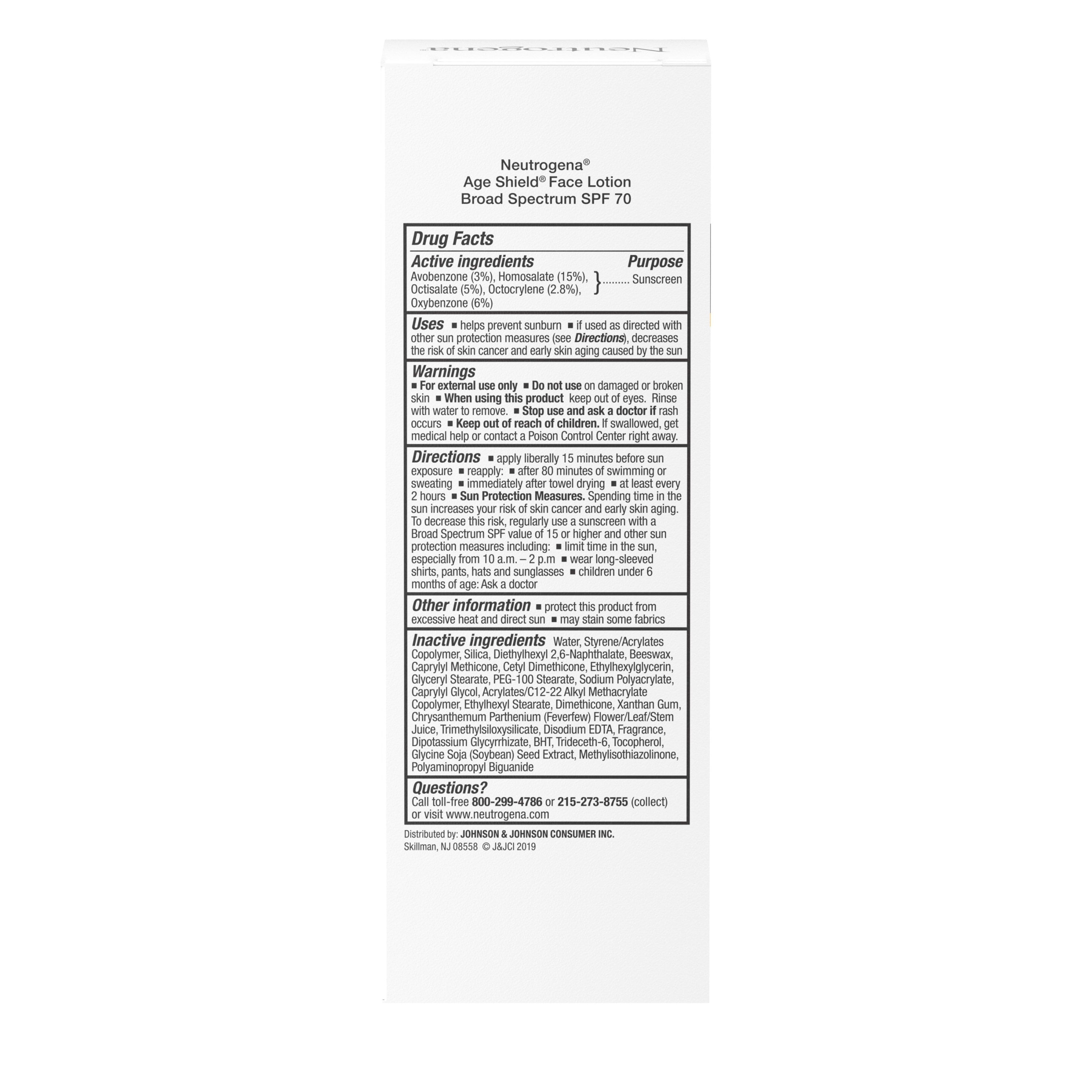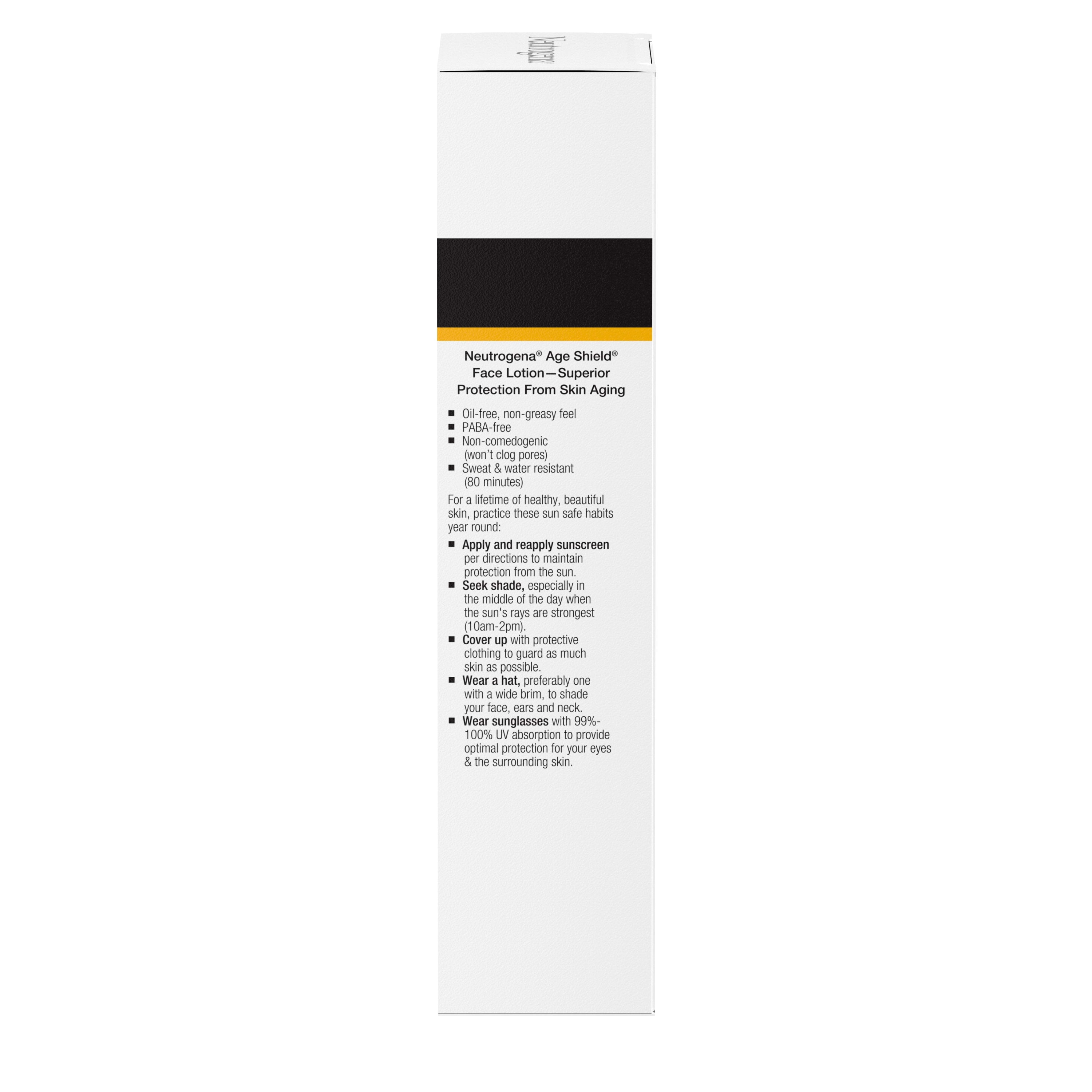 Help keep your skin protected from damaging UV rays with Neutrogena Age Shield Oil-Free Face Lotion Sunscreen with Broad Spectrum SPF 70. Formulated with Helioplex, a sunscreen technology, the Broad Spectrum facial sunscreen shields skin six-layers deep from the sun’s damaging rays. Our sunscreen screens burning UVB rays and helps stop aging UVA rays from penetrating surface layers for deep cellular protection. This dermatologist-tested moisturizing sunscreen also contains skin conditioners to hydrate and replenish skin. When used as directed with other sun protection measures, our SPF 70 face sunscreen can help decrease the risk of skin cancer and early skin aging caused by the sun. Its unique formula is PABA- and oil-free as well as non-comedogenic so it won’t clog pores. Packaging and formulation may vary. New formula contains no oxybenzone and uses avobenzone for optimal protection from UVA & UVB rays. Neutrogena Age Shield Oil-Free Face Lotion Sunscreen with Broad Spectrum SPF 70. Sheer facial sunscreen helps shield skin from sun damage while also preventing signs of skin aging. Made with Helioplex, a sunscreen technology with Broad Spectrum UVA/UVB protection. Our face sunscreen works to protect skin and helps maintain a youthful appearance. Sunscreen shields skin six-layers deep from the sun’s damaging rays for deep cellular protection. Dermatologist-tested, this moisturizing sunscreen also contains skin conditioners to hydrate skin. Its unique formula is PABA- and oil-free as well as non-comedogenic, so it won’t clog pores. Packaging and formulation may vary. New formula contains no oxybenzone and uses avobenzone.