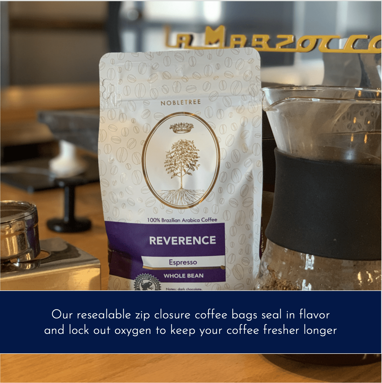 Made from 100% Arabica Beans, Nobletree Premium Coffee is grown on our Rainforest Alliance Certified farms in Brazil. By focusing on quality and sustainability, our hand-picked beans have won the Cup of Excellence (BSCA) for over eight years. Our small-batch coffee roasting facility in Brooklyn, NY precision roasts coffee beans for smooth balanced flavors and aromas in every cup. We passionately roast in small batches at our historic Brooklyn roaster, creating a smooth, delicious flavor and amazing aroma. This specialty, third-wave coffee is an ideal bean for brewing gourmet drip coffee, cappuccinos, espresso, and for the home barista who loves French Press, Chemex Pour Over, Hario V6, or Aeropress coffee methods. Reverence is a gourmet, Whole Bean, espresso coffee with a blend of single-sourced 100% Arabica Beans from our privately-owned, Rainforest Alliance Certified and award-winning Brazilian farm. This dark roast is in a 20 oz coffee bag with a resealable zip closure to seal in flavor and lockout oxygen to keep your whole bean coffee fresher longer Flavor notes include Dark Chocolate, Marzipan, and Truffle.