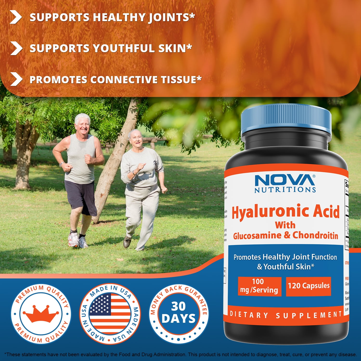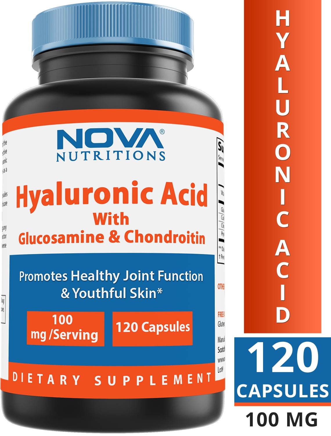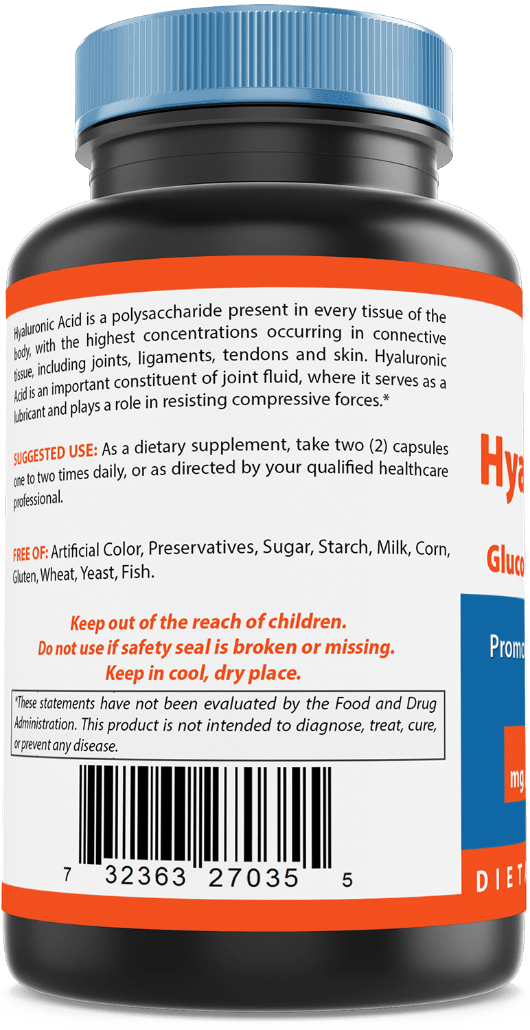 Hyaluronic Acid is a compound present in every tissue of the body, with the highest concentrations occurring in connective tissues such as skin and cartilage. Hyaluronic Acid is an important constituent of joint fluid, where it serves as a lubricant and plays a role in resisting compressive forces.Supports Healthy JointsSupports Youthful SkinImportant Joint LubricantMade in USANova Nutritions Hyaluronic Acid with Glucosamine Chondroitin 100mg per serving 120 Capsules