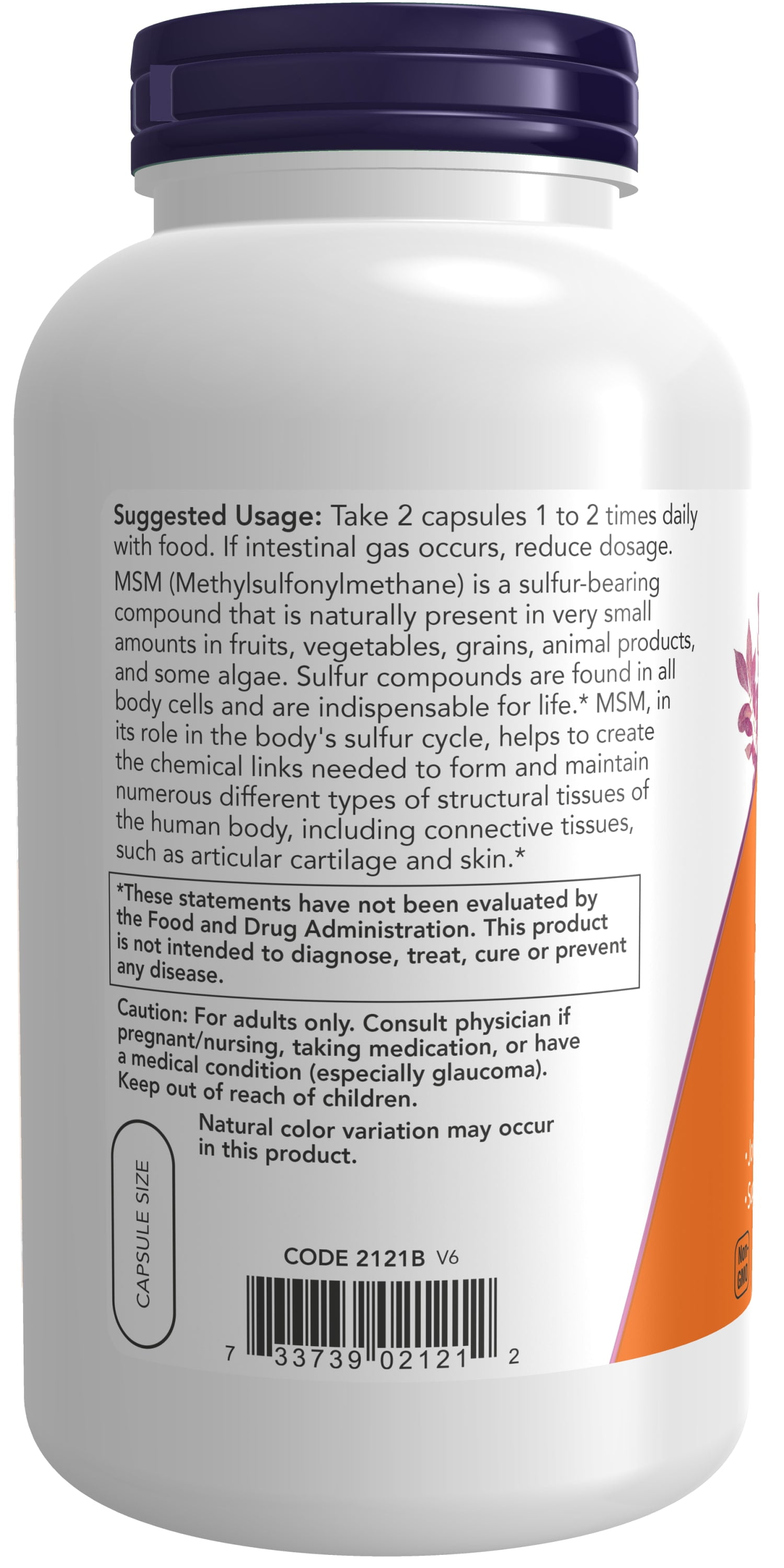 MSM (Methylsulfonylmethane) is a sulfur-bearing compound that is naturally present in very small amounts in fruits, vegetables, grains, animal products, and some algae. Sulfur compounds are found in all body cells and are indispensable for life.* MSM, in its role in the body’s sulfur cycle, helps to create the chemical links needed to form and maintain numerous different types of structural tissues of the human body, including connective tissues, such as articular cartilage and skin.* Natural color variation may occur in this product.