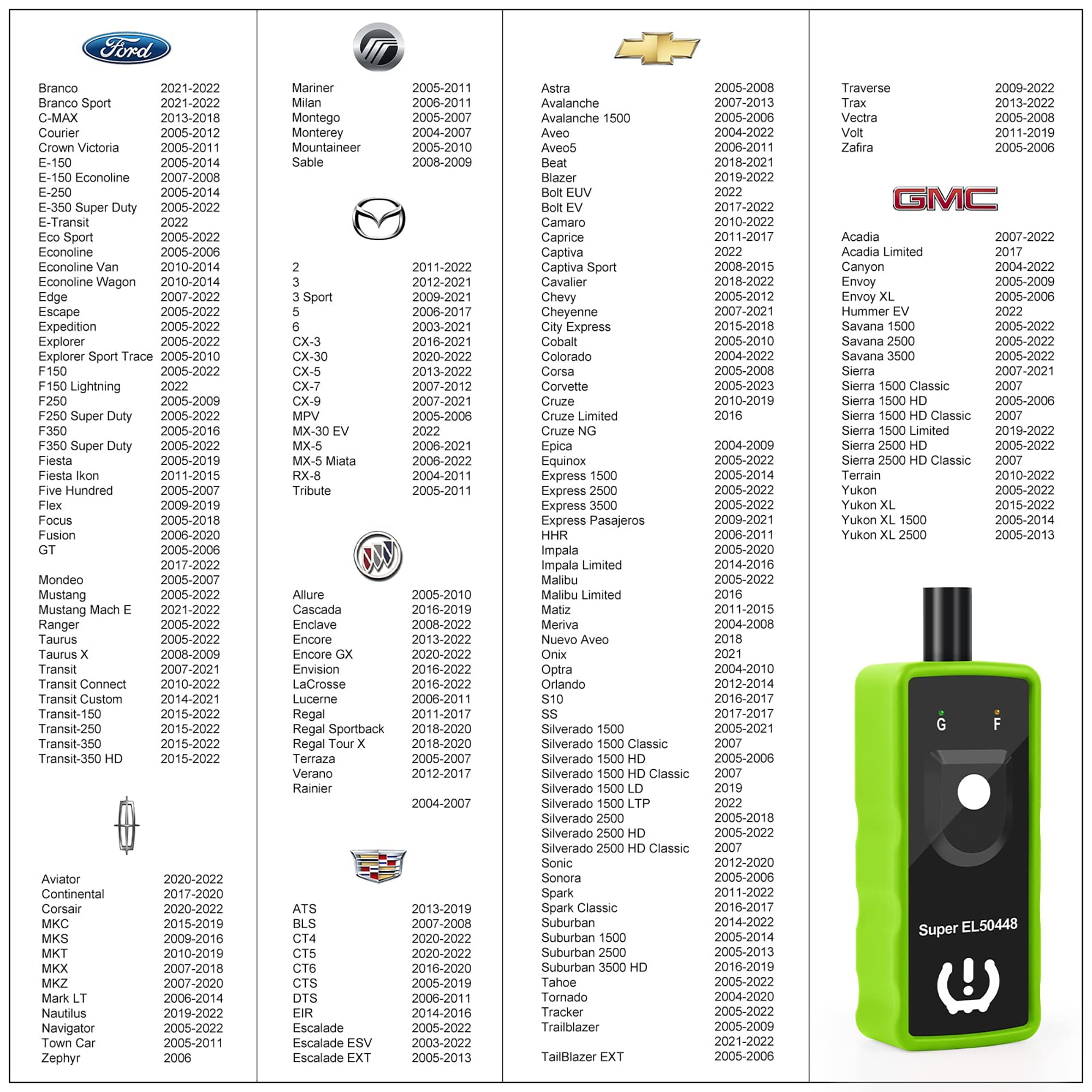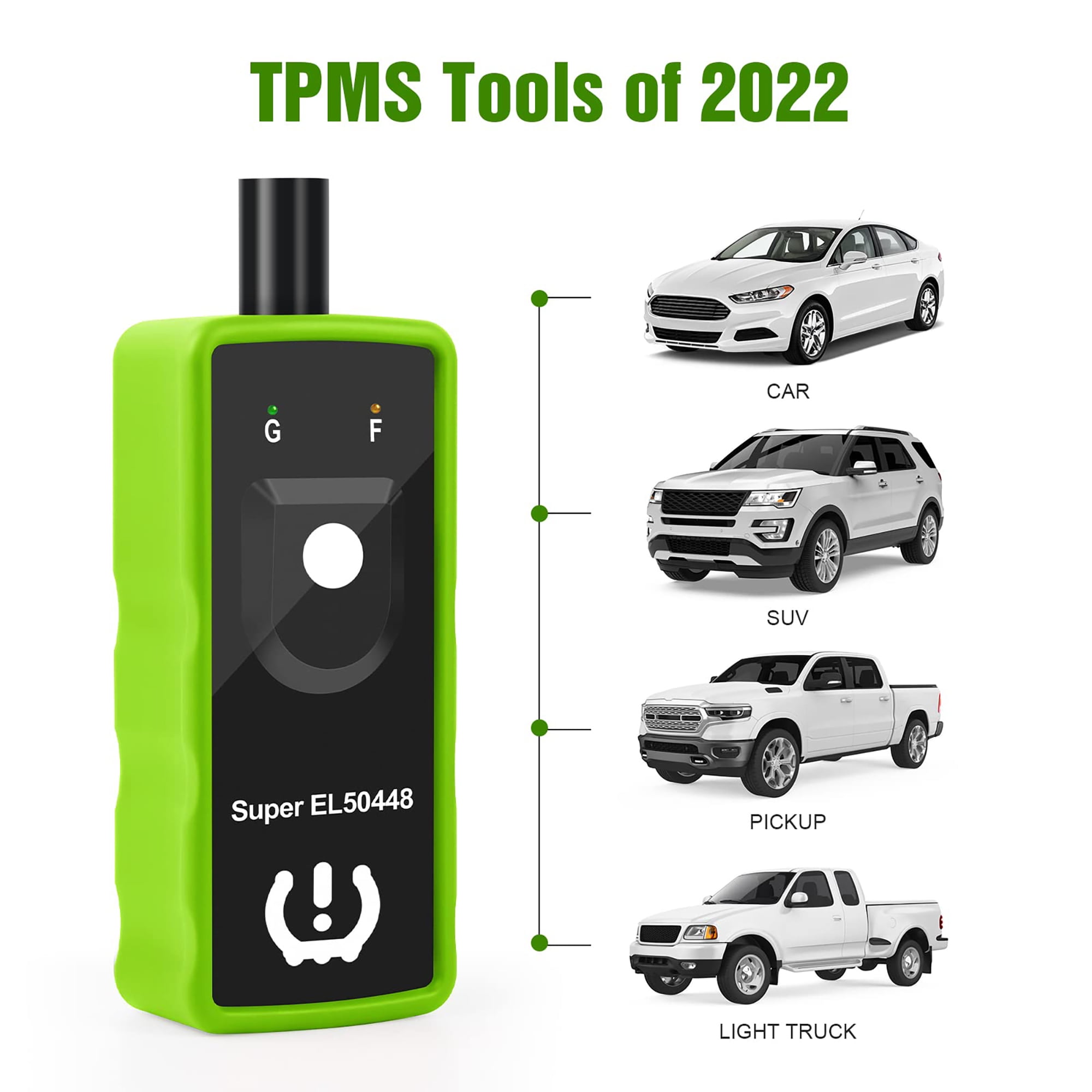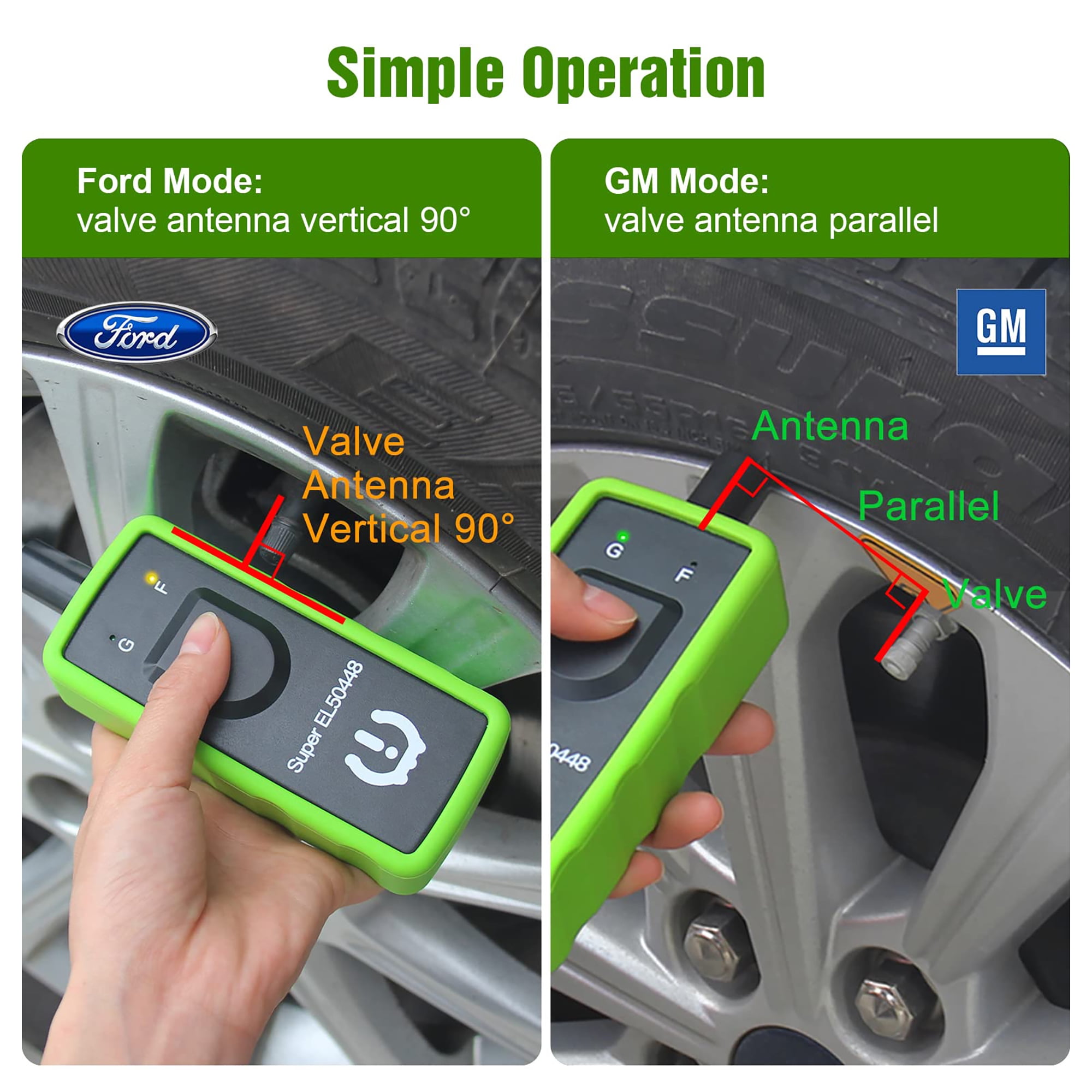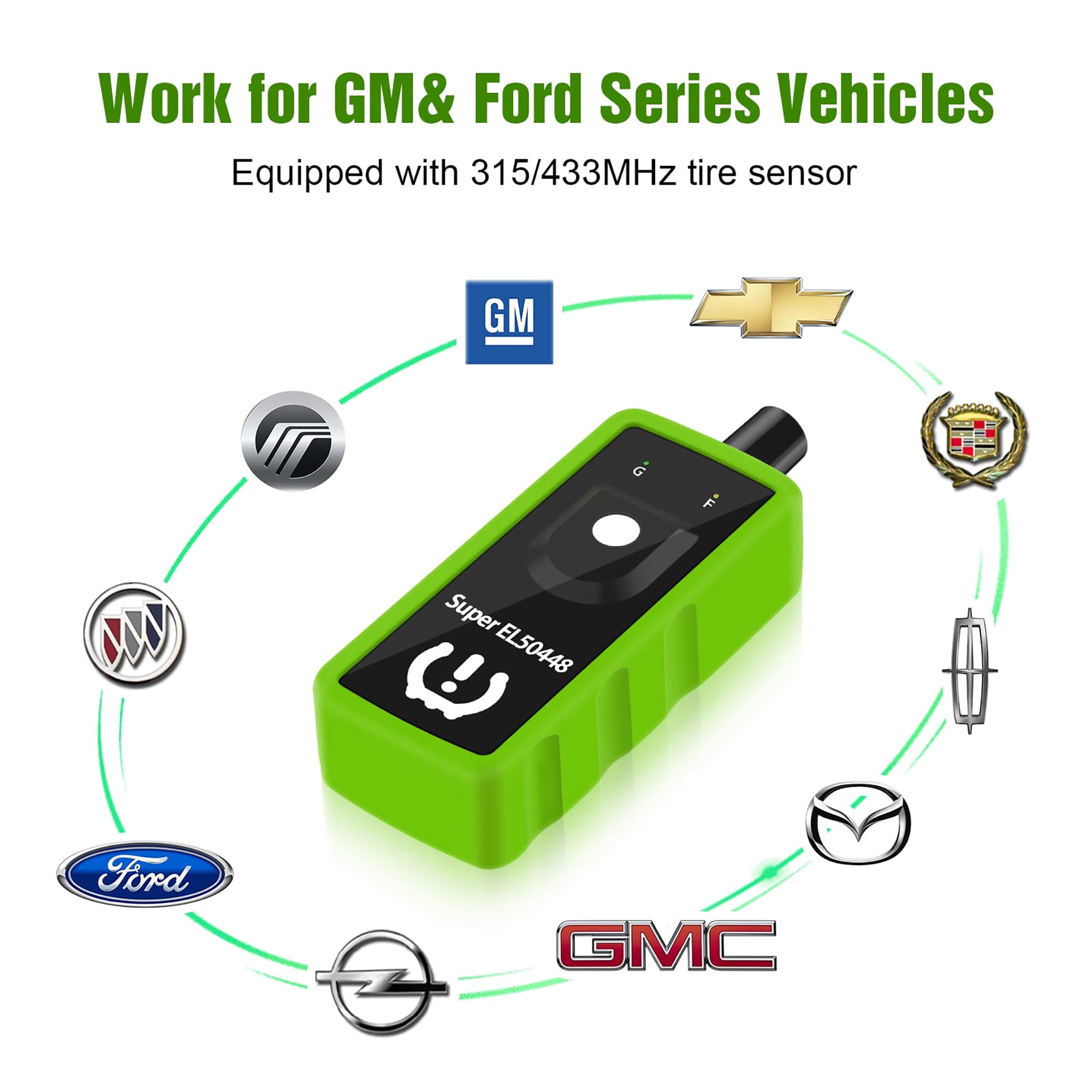 Tips before using:1. Equipped with 315/433MHz tire sensor.2. Works on both GM and Ford Series Vehicles, including Opel, Buick, Cadillac, Chevrolet, GMC, GM, Lincoln, Mercury, Mazda, F150, F250, Focus, Fusion, etc.3. Please use a NEW 9V battery, the battery is not included in the package.4. Please make sure the antenna fits in the CORRECT position.5. Not for heavy trucks with more than 4 tires6. The TPMS tool is unable to reprogram sensors, it’s a reset tool.7. Do tire reset outside instead of in the garage.8. For different vehicles Super EL50448 may need different times to reset all of your tire sensors after rotation.9. Position of tires is also important, Front tires have to be straight.10. Sensors should be original OEM sensors which well programmed.