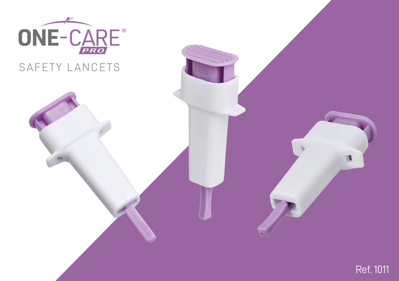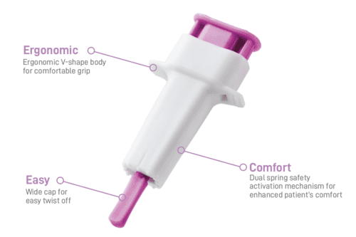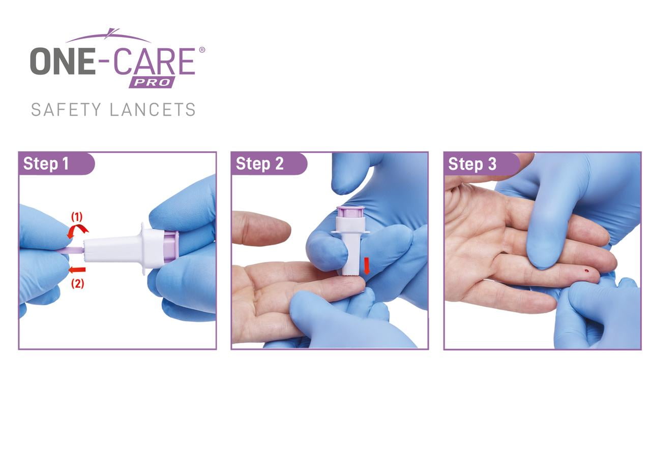 MediVena ONE-CARE PRO Push Button Activated Safety Lancets offer excellent ergonomics with T-shape main housing, comfortable wings and concaved button for stable grip within the hand and easy activation. ONE-CARE PRO Safety Lancets feature long safety tab for convenient twist off and pull out, optimized skin contact area of round shape for convenient placement on the test site, low trigger force for convenient activation. Dual-spring mechanism allows for quick and gentle puncture for enhanced comfort. Automatic and reliable needle retraction helps protect against accidental needlestick injuries. Built-in needle depth control provides for consistent and accurate sampling results.