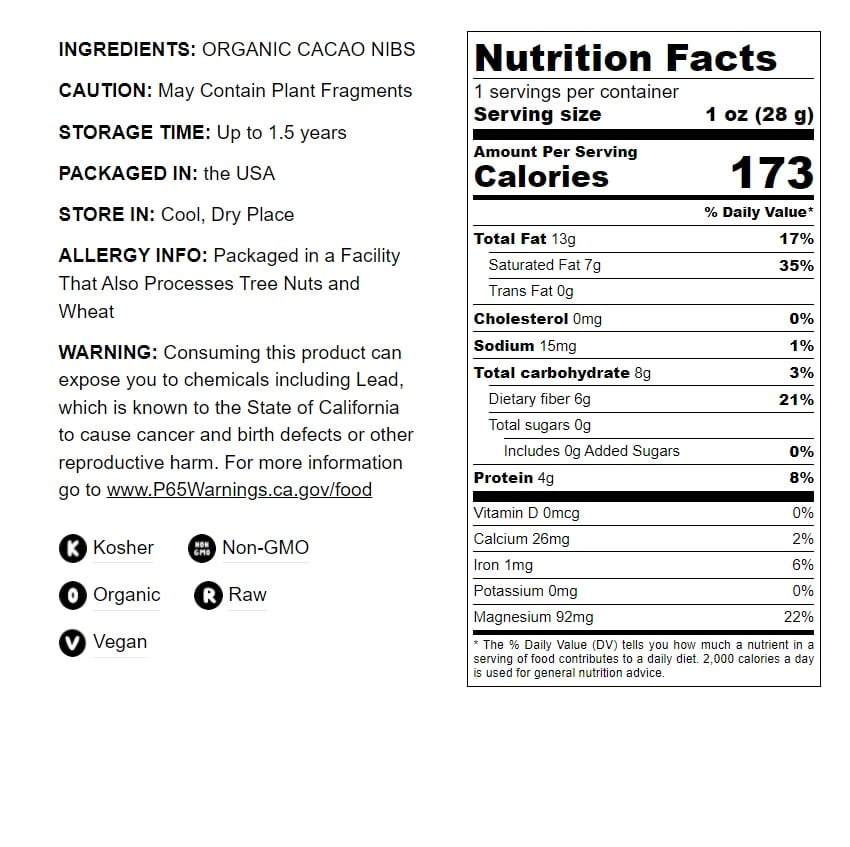 - ✔️SOURCE OF IRON AND MAGNESIUM: Organic cacao nibs contain lots of iron, magnesium, manganese, phosphorus, and fiber.