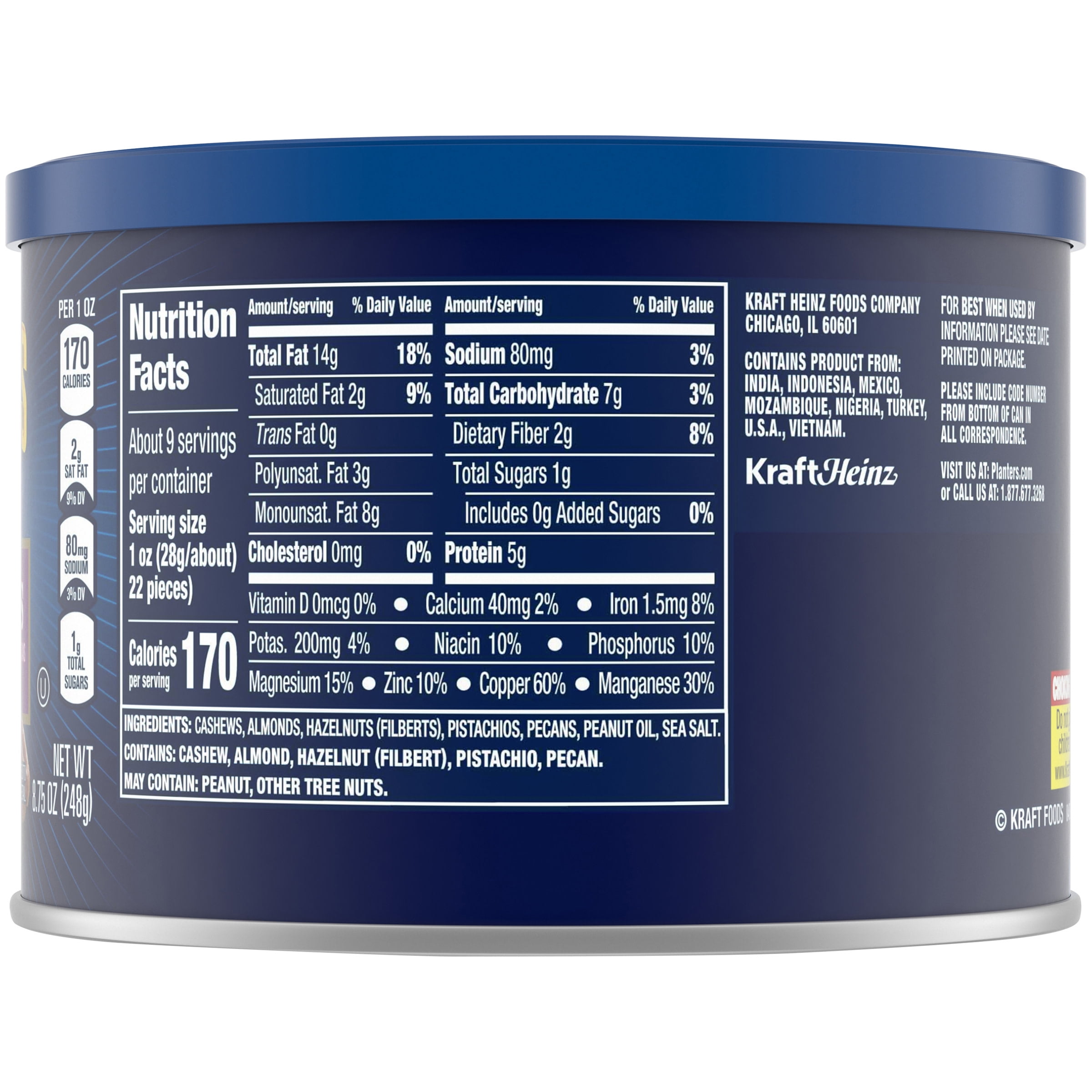 Planters Deluxe Mixed Nuts With Hazelnuts is a tasty assortment of roasted nuts, including cashews, almonds, hazelnuts, pistachios and pecans. The slightly sweet hazelnuts add satisfying buttery flavor to the can of mixed nuts. Roasted to crispy perfection in peanut oil and seasoned with sea salt, these mixed nuts have a hearty taste and a crunchy texture, making them a savory snack that everyone in the family is sure to enjoy. These nutritious roasted mixed nuts with no peanuts contain 170 calories per 1 ounce serving, which means they help ward off hunger and are great to take along on road trips or for munching during movie night. The roasted mixed nuts are Kosher-approved and come in an airtight can with a resealable lid to ensure freshness. Pop open a 8.75 ounce canister of mixed nuts and enjoy this flavorful crunchy treat.