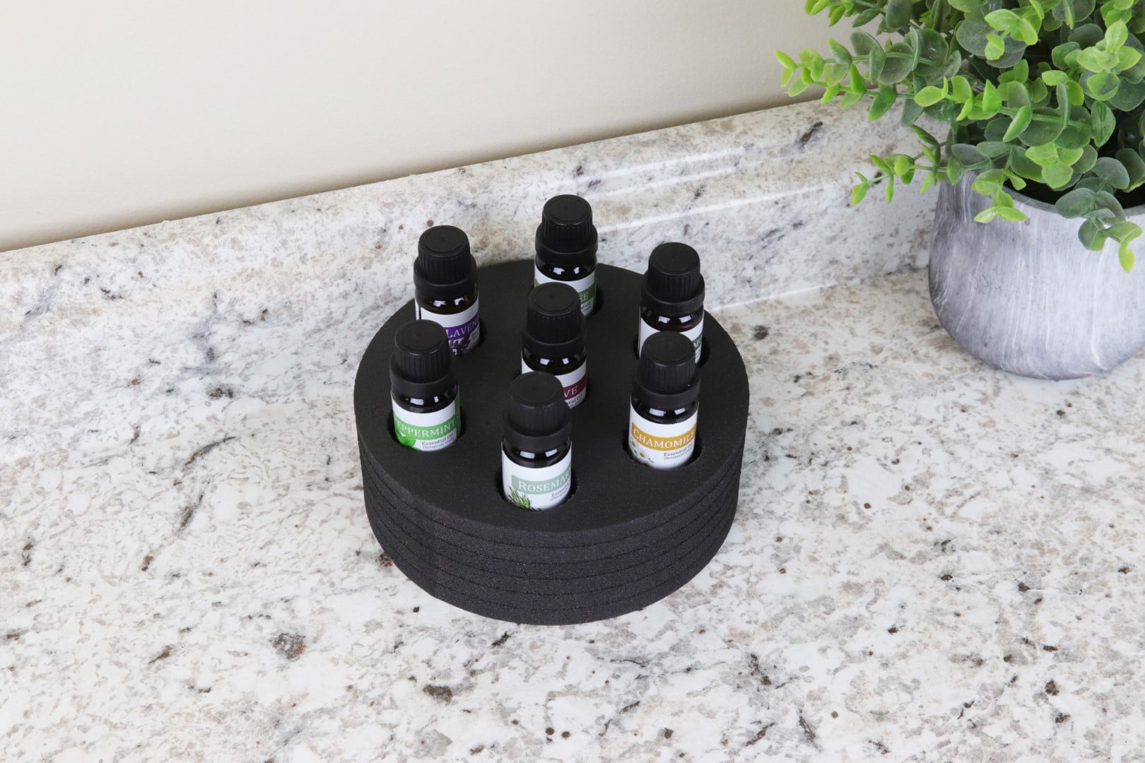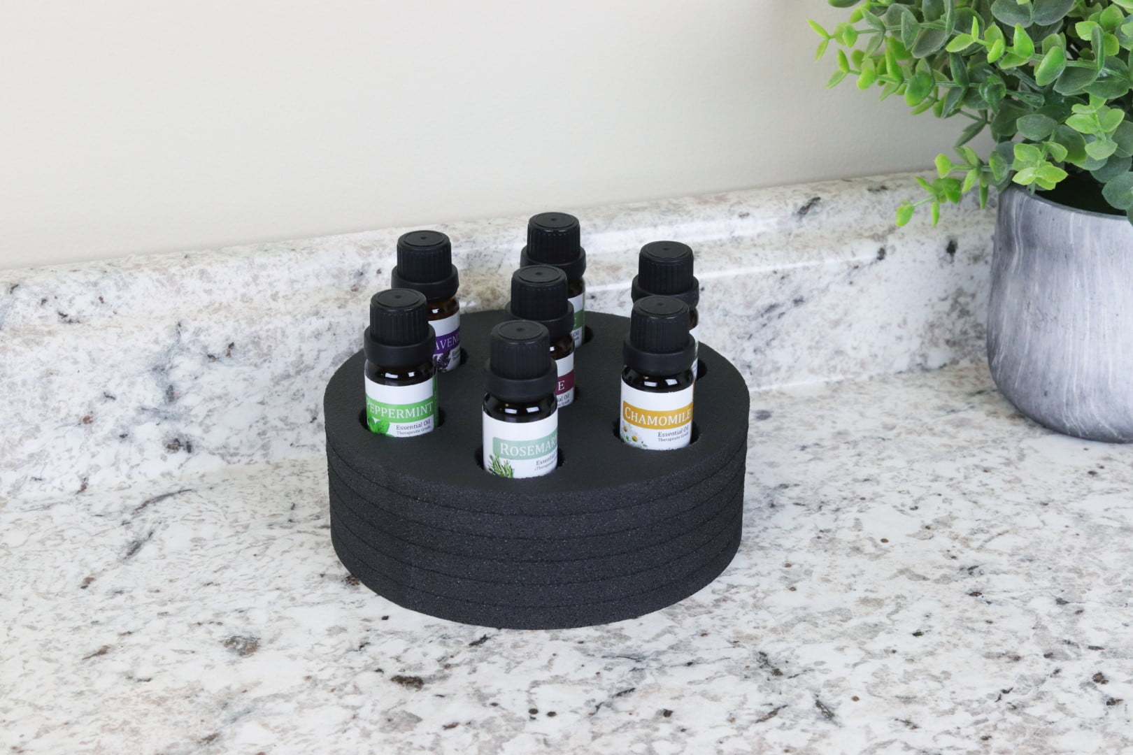 Organize and display your beautiful essential oil collection in a unique and stylish way with the premium Polar Whale Essential Oil Organizer. Includes 1 black high density foam organizer that holds up to 7 essential oil bottles (1.2" wide pockets comfortably fit 5ml to 15ml bottles). Make optimal use of your precious space, while keeping your all of your favorite essential oils organized and within easy reach. Ideal for the home, office, bedroom, bathroom and more, this gorgeous stand will keep it all nice and tidy on your dresser, countertop, desk, table or vanity. Made from elegant lightweight yet durable high density waterproof black foam material, this attractive organizer is non-slip, anti-rattle and super-easy to clean (rinse it off, or wash it in the top rack of your dishwasher). Measures approximately 6" wide.