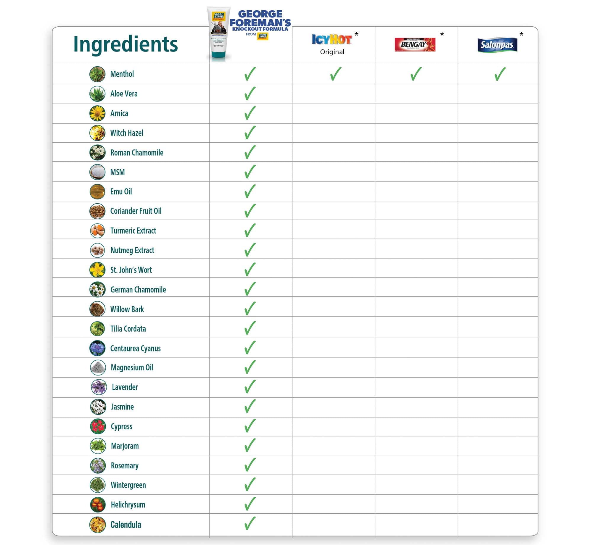 Naturally, this Champ’s formula is stacked for a powerful punch. George Foreman’s KNOCKOUT FORMULA contains wintergreen oil to deliver a gentle cooling sensation, and it’s infused with our maximum concentration of menthol (1.5%). And with 24 of nature’s ingredients in all, it has more than any other Real Time Pain Relief formula to date. The best part? It gets the job done without parabens, SLS, artificial dyes, GMOs, NSAIDs or acetaminophen.