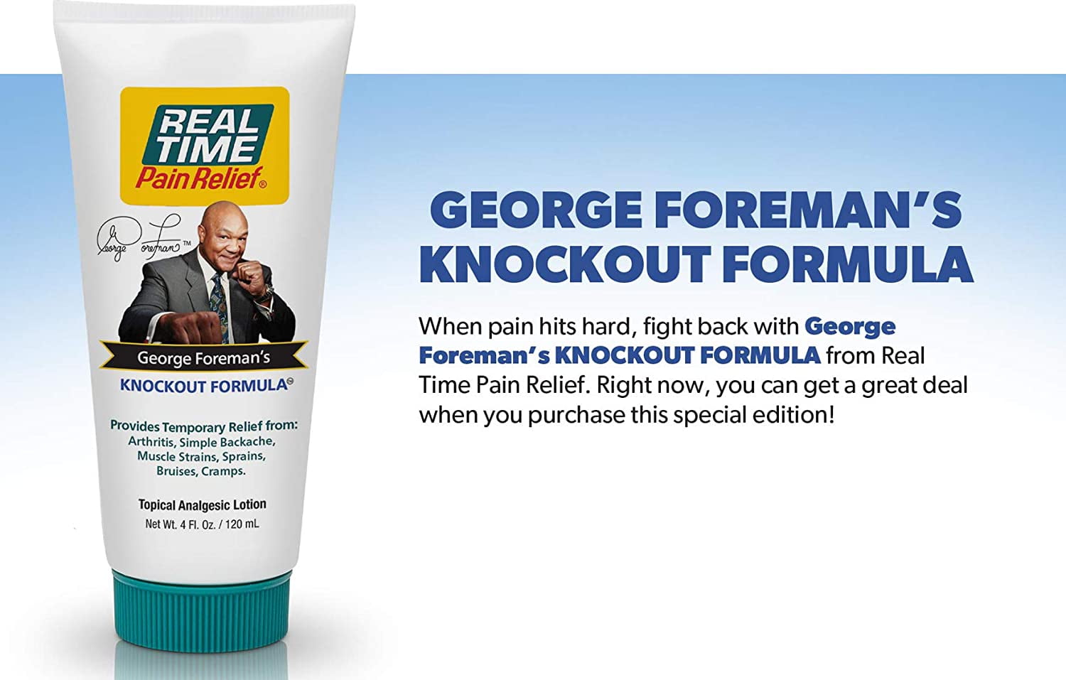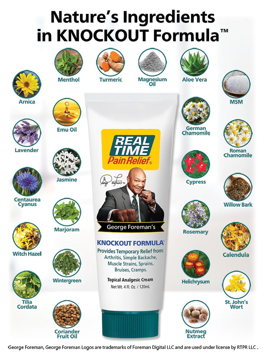 Don’t let pain keep you down for the count. Fight back—and win—with George Foreman’s KNOCKOUT FORMULA. From arthritis, simple backache and muscle strains to bruises, sprains and cramps, just “Real Time It” with George Foreman’s KNOCKOUT FORMULA and deliver a powerful punch to your pain.