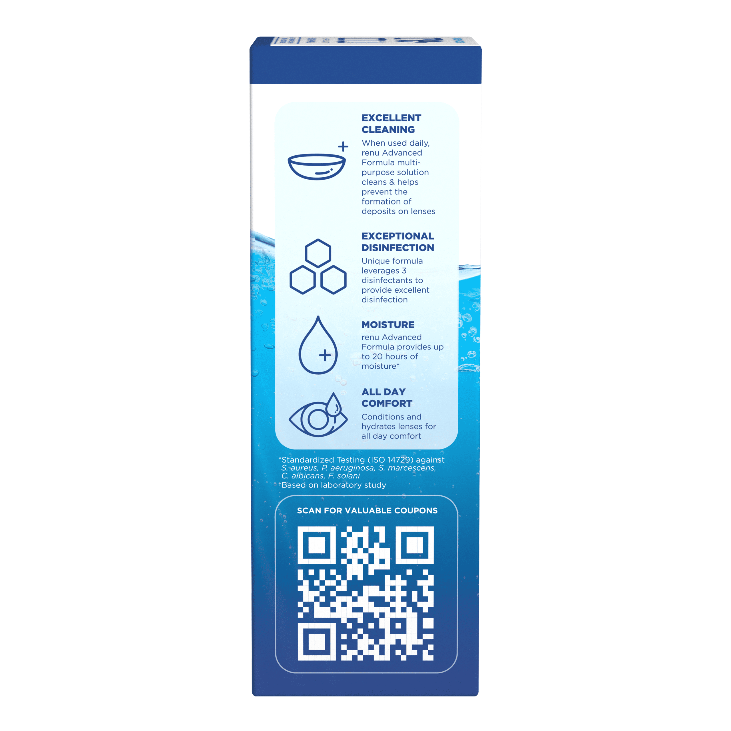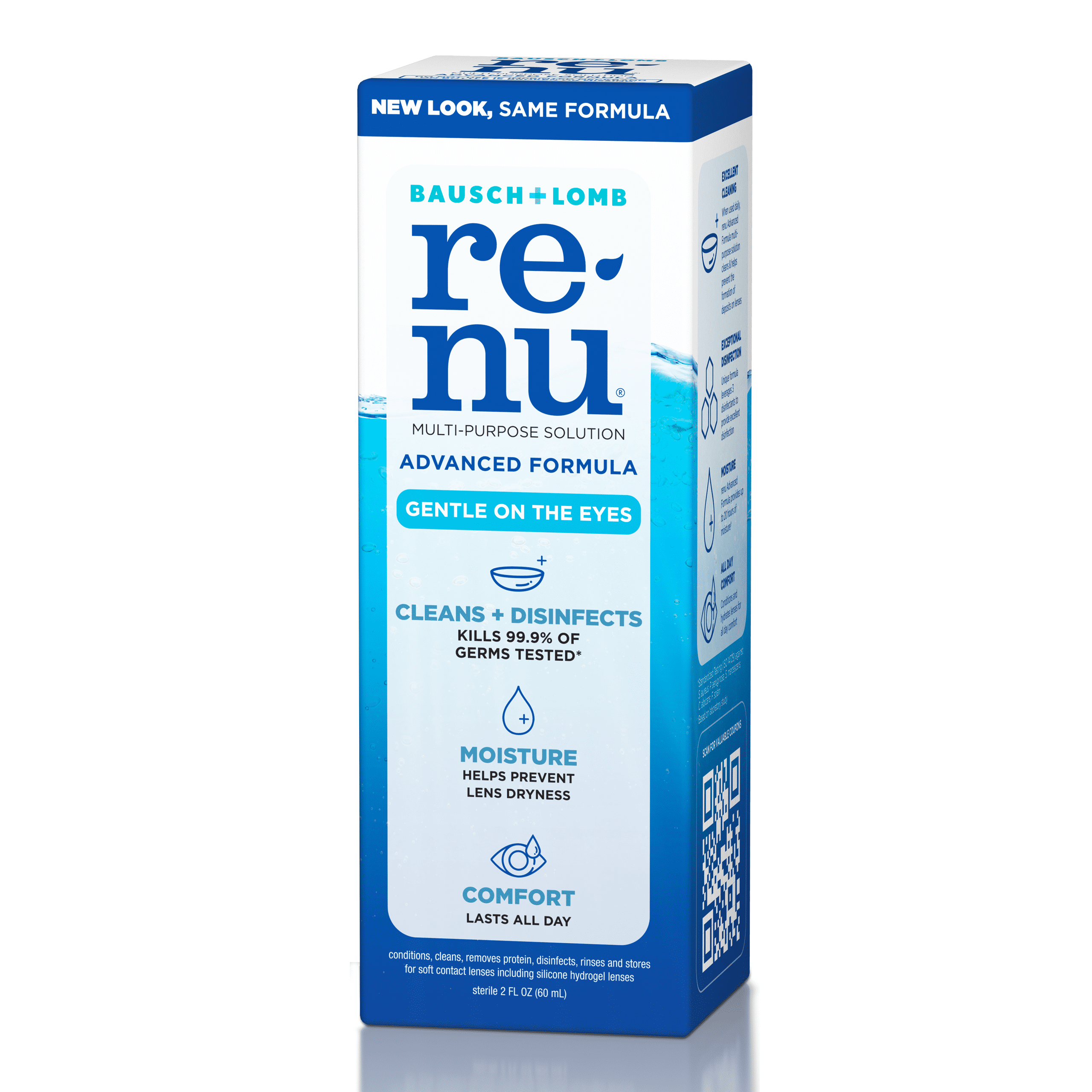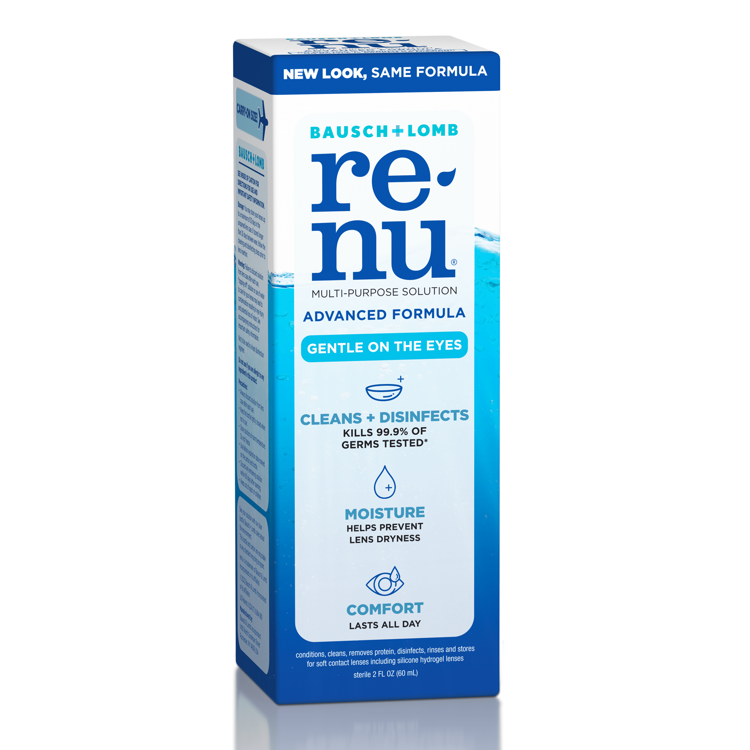 renu Advanced Formula contact lens solution combines three disinfectants to kill 99.9% of germs tested*. From the eye care experts at Bausch + Lomb, renu is a multi-purpose lens solution that provides a triple disinfectant system for excellent cleaning along with all day comfort. When used daily, renu Advanced Formula multi-purpose solution dissolves protein and cleans while loosening and removing irritating accumulations of film, debris and deposits from soft contact lenses.The renu contact lens solution conditions, cleans, removes protein, disinfects, rinses, and stores soft contact lenses, including silicone hydrogel lenses. Plus, the enhanced conditioning system provides up to 20 hours of moisture.•Advanced Formula multi-purpose solution for contact lenses•Cleans, removes protein, disinfects, rinses, and stores•Enhanced conditioning system for up to 20 hours of moisture2•Contact disinfecting solution kills 99.9% of germs tested*•From the eye care experts at Bausch + Lomb