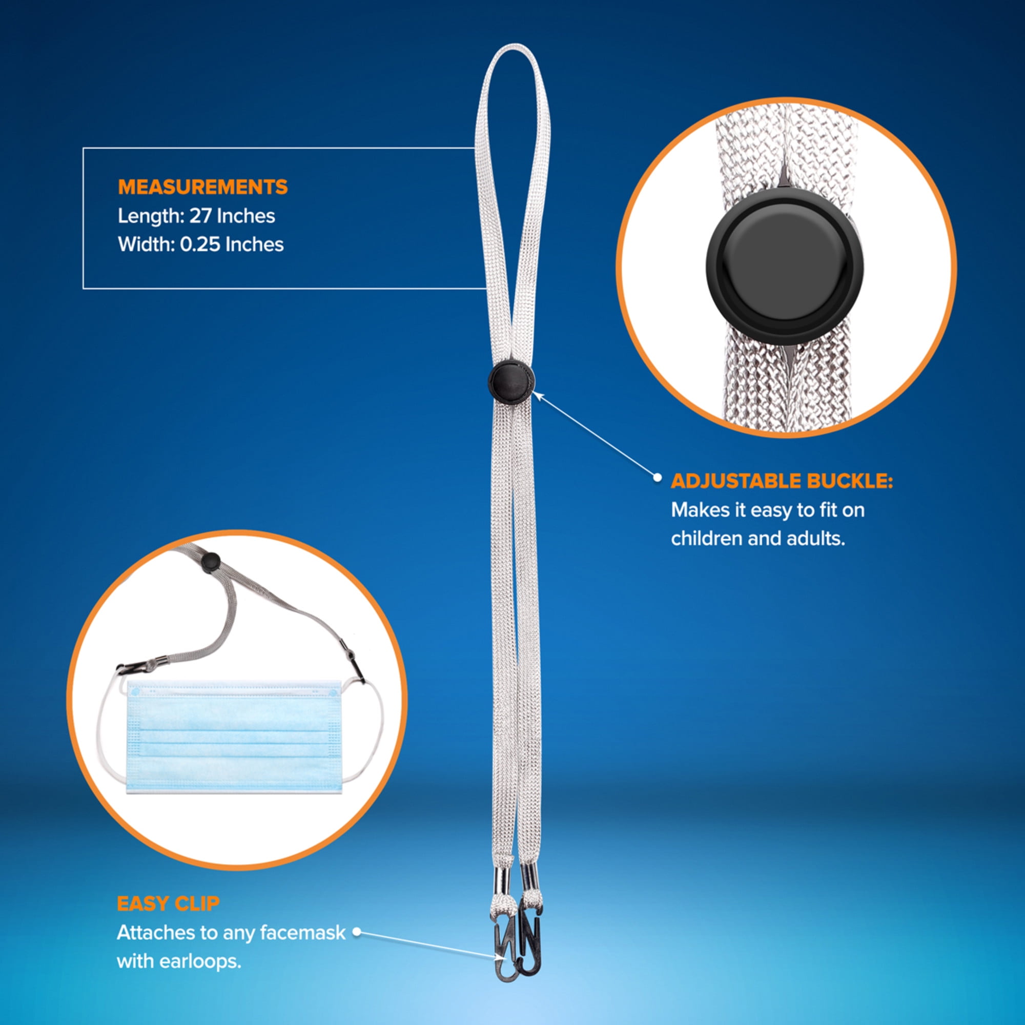 The RightCare Adjustable Face Mask Lanyard is the perfect accessory for any face mask with earloops. It keeps your mask on you at all times so you never have to worry about dropping the mask on the floor, scrunching it up in your pocket, or leaving it behind. The clips attach to the earloops on any mask and it hangs around your neck when you remove the mask. The sliding buckle easily adjusts to fit around the head or neck of children and adults for a true one size fits all. _x000D__x000D__x000D__x000D_The lanyard measures 27 inches in length and 0.25 inches in width. It’s lightweight and virtually feels like it’s not there while you wear it. The soft polyester material is comfortable and won’t rub on your neck to cause discomfort.RightCare Lanyard for Face Mask Universal, Gray, 10 Pack