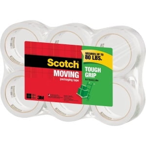 Put weight in its place with Scotch Tough Grip Moving/Packaging Tape. For a fully packed moving day, heavy boxes that bust at the bottom are the enemy. This moving tape easily handles moving boxes with up to 80 lb. inside and is guaranteed to stay sealed. What makes this tape so tough is its unique and strong hot melt adhesive. When the box is closed, it stays closed. Tape grips strong to all box types, including harder-to-stick-to boxes made with 100 percent recycled fibres. As tough as it is, it slides off the roll smoothly, quietly and easily – a nice touch for a hard day of packing and moving.