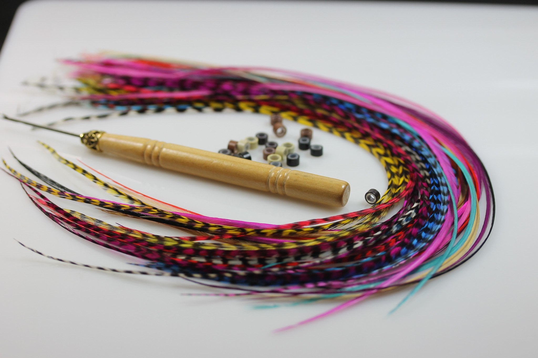 Quantity: 20 Loose Feather Hair Extensions in a mix of rainbow colors100% Real Rooster Feathers, 8-11" in length (20-28cm)Includes 20 beads and Professional loop tool for installationCan be washed, styled, flat ironed, and curled with your natural hairSalon Quality Feathers; Will last for months with proper care