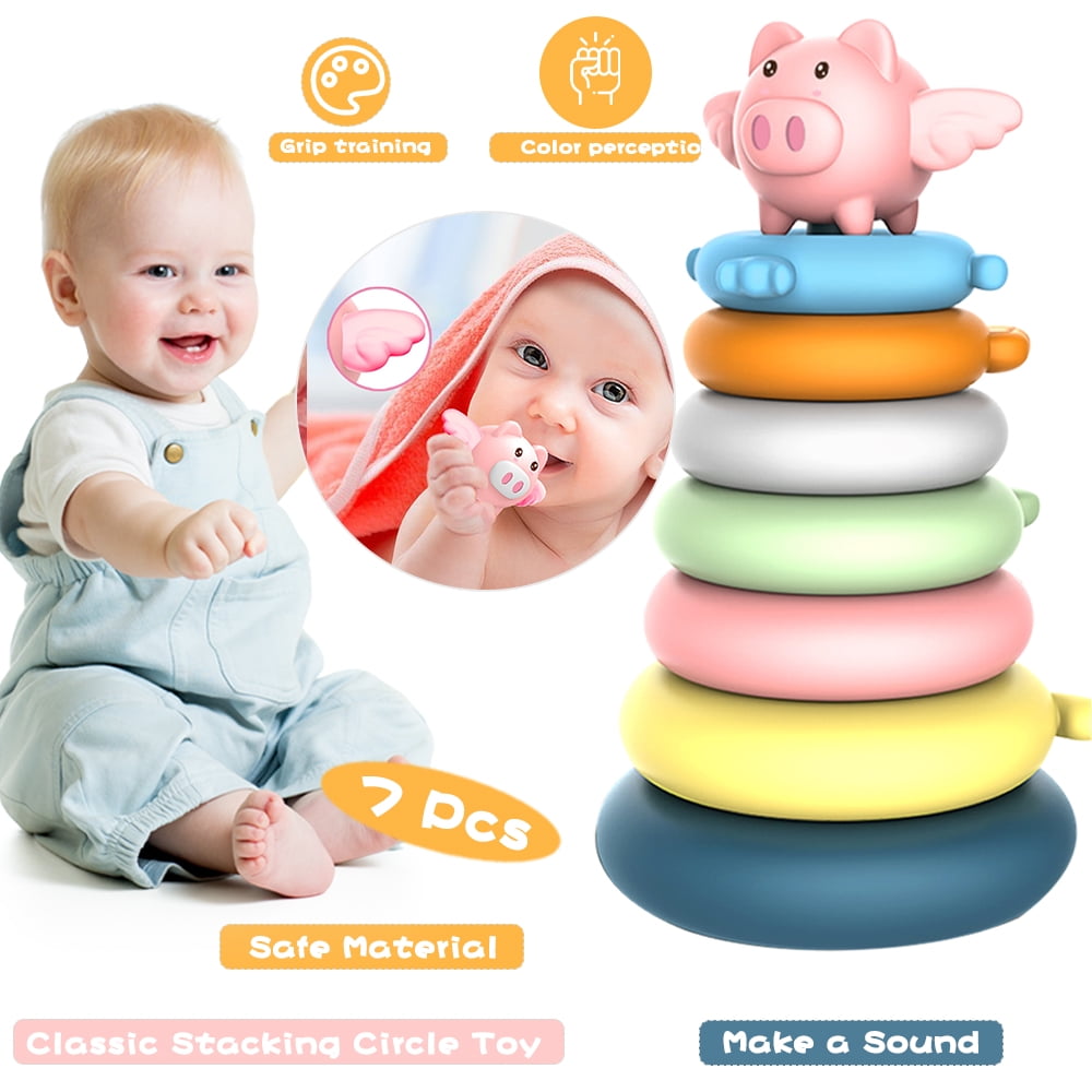 SHELLTON 7 Pcs Stacking & Nesting Rings Toy, Soft Circle Stacker, Building Stacker,Teethers for Baby, Colorful Animal Pattern, Baby Bathing Toy, Toddler Learning Toys for 6 Month Old Boys Girls