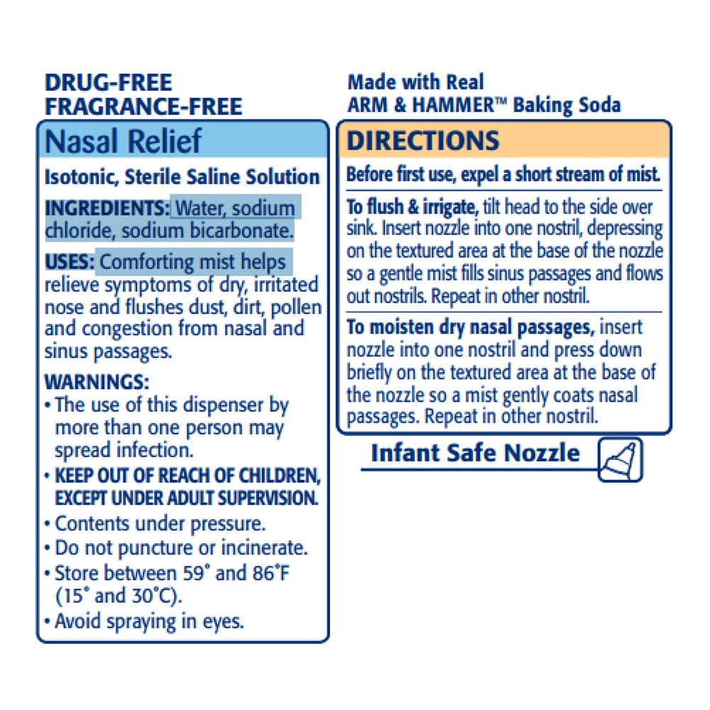 Discover the European secret to clear breathing.Nasal MistChurch/DwighActive Ingredients:Purified Water; Sodium Chloride 0.9%1. To flush and irrigate, tilt infant or child’s head to the side over sink. Insert nozzle into one nostril depressing as a gentle mist fills sinus passages and flows out nostrils. 2. To moisturize, insert nozzle into each nostril and press as moisture is restored to dry nasal passages. Use as often as needed (non-habit forming, non-addicting).Uses:Comforting mist relieves symptoms of dry irritated nose as gentle misting flushes dust, dirt, pollen and congestion from nasal and sinus passages. Preservative and drug free. Remains sterile throughout use. Infant safe – does not damage delicate nasal tissue. Provides gentle irrigation traditionally used for cold prevention.The use of this dispenser by more than one person may spread infection. Keep out of reach of children. Contents under pressure. Do not puncture or incinerate.