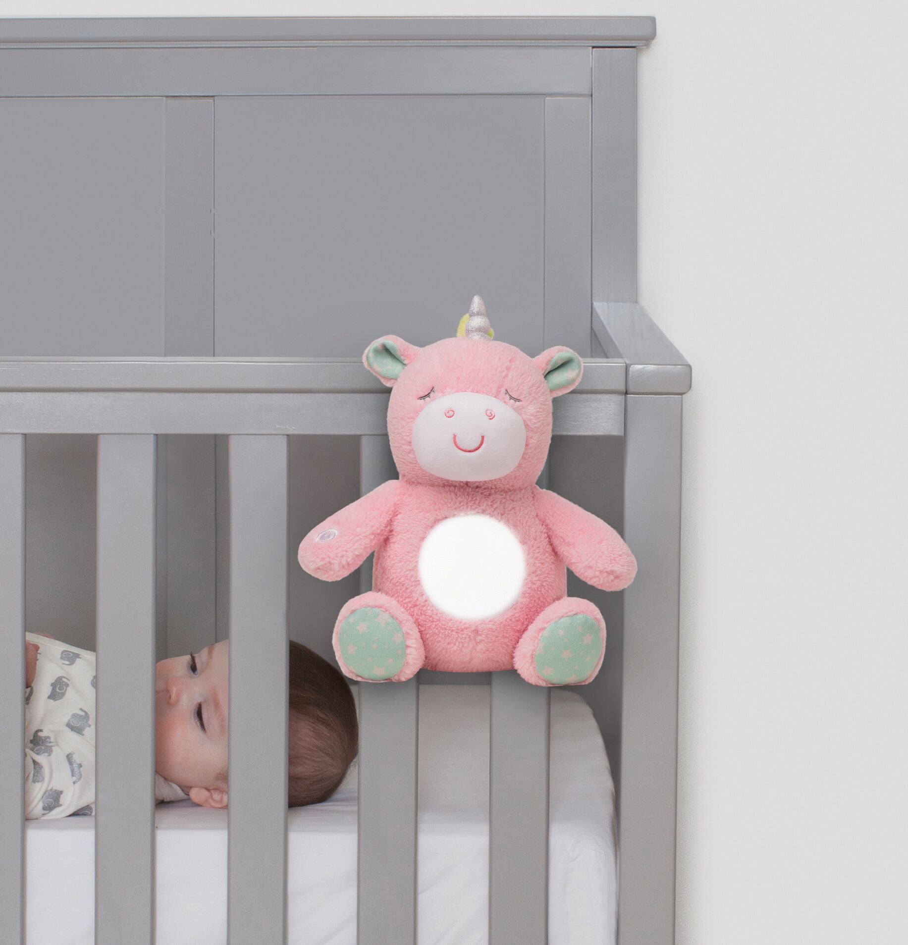 Soft Dreams Unicorn Music & Glow Soother is a cuddly plush with light up belly and gentle melody that soothes baby while developing comfort and security to help baby transition into sleep. This soother features music and a soft glow, a timer with auto shut off and an on/off switch for one touch control. Convenient strap on back attaches elephant to crib, stroller and more.