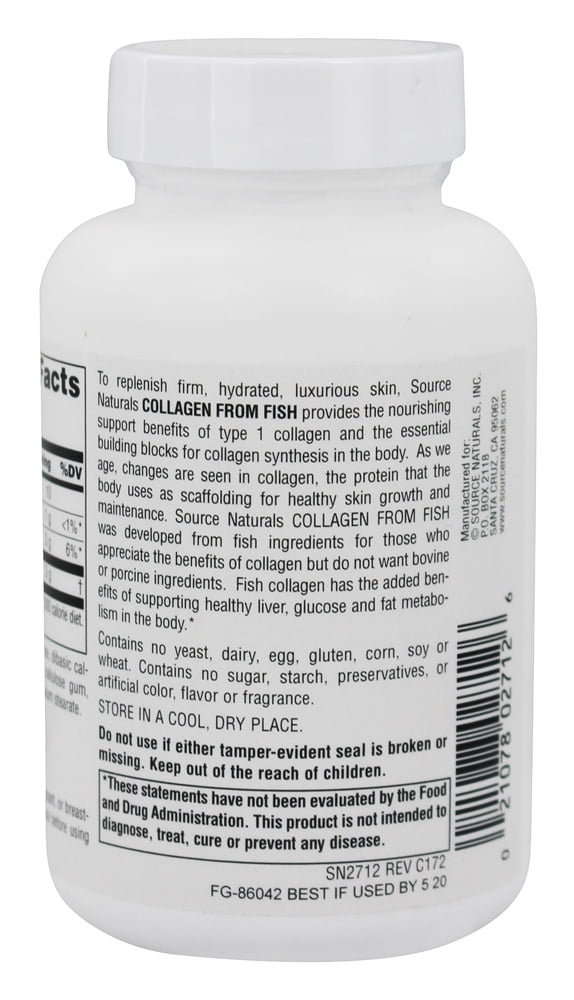 Source Naturals – Collagen From Fish Healthy Skin Support – 60 Tablets Source Naturals Collagen From Fish Healthy Skin Support provides the nourishing support benefits of type 1 collagen and the essential building blocks for collagen synthesis in the body. As we age, changes are seen in collagen, the protein that the body uses as scaffolding for healthy skin growth and maintenance. Source