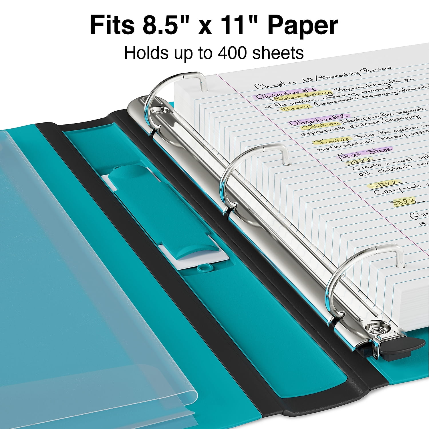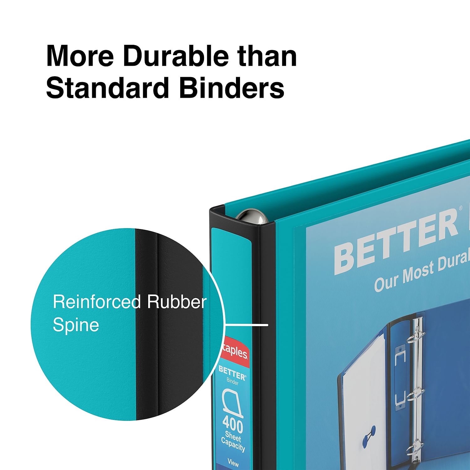 Keep your documents neat and organized with this Staples Better teal 1.5-inch D-ring view binder.Get a durable and reliable paper security solution with this Staples Better D-ring view binder. The view binder has a high storage capacity of up to 400 sheets for all your documents, and a reinforced rubberized spine and edges offer protection from the rigor of everyday use. This Staples 1.5-inch D-ring view binder features tabbed rings that provide quick access to documents and secures them in place. Light blue better binders to protect work documents and keep them organized. 1 1/2 inch binder. Dimensions: 11.7"H x 11.1"W x 2.4"D. Three D-Rings keep pages secure. 400-sheet capacity for organizing large projects. Wide design accommodates letter-sized papers. One pocket for organization. Insert a custom removable spine label for easy identification of the contents.Large Page CapacityOrganize extra-large documents with the Staples Better view binder , which features 1.5-inch D-rings that hold up to 400 pages. This binder is ideal for bulky documents, including manuals, training materials and standard operating procedures.DurableWith a sturdy rubberized spine and edges, the Staples nonstick 1.5-inch D-ring binder resist tearing and splitting for a long use life. The tabbed rings open easily for quick access to pages and close firmly to hold them in place.Archival SafeThe Staples 400-sheet view binder is made of nonstick plastic that won’t rub or transfer ink from pages, so it is safe for long term storage of important documents. It also has wide covers that keep sheet protectors or page separators safely tucked away. Sold as 1 Each.