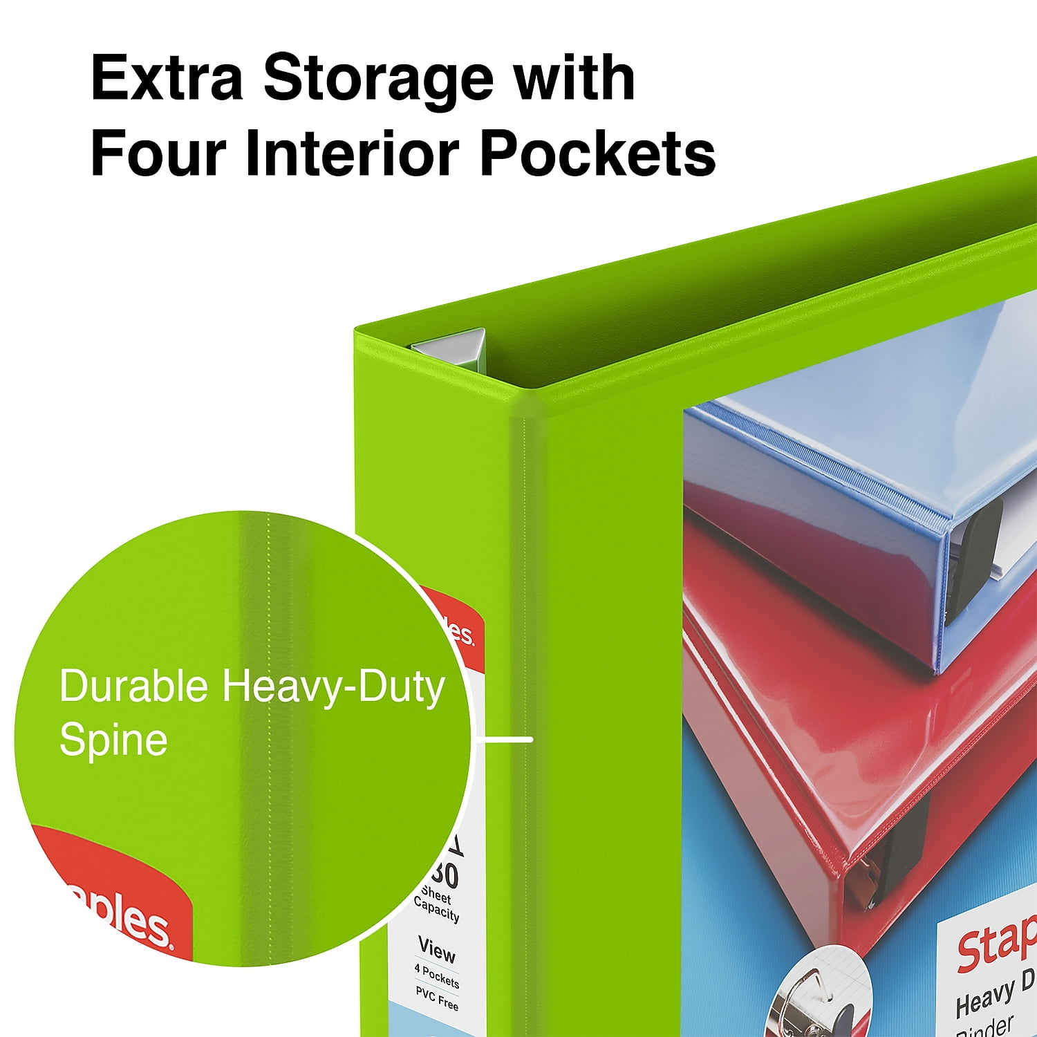 Enjoy the convenience of smooth-turning pages with this Staples heavy duty 2-inch D-ring view chartreuse binder.Use this heavy duty view binder to create training manuals and other reference material. The covers are constructed with sturdy, non-stick material that doesn’t smear ink or toner on printed pages, while the four stacked pockets offer additional organization options and room for loose pages. This Staples 2-inch D-ring view binder has back-mounted rings that let pages lie flat and can hold up to 500 sheets. Chartreuse heavy duty view binder is an excellent choice for storing spreadsheets and other papers. 2 inch binder. Three D-rings keep pages secure. Easy Locking Rings open with ease and keep pages secure. Holds up to 480 sheets. Durable covers are made of plastic with nonstick surface. Four interior pockets for added organization. Insert a custom spine label for easy identification. Accommodates 8.5"" x 11"" letter-sized papers. PVC free – made from plastics using fewer harmful chemicals and with reduced emissions during manufacturing. Sold as 1 Each.