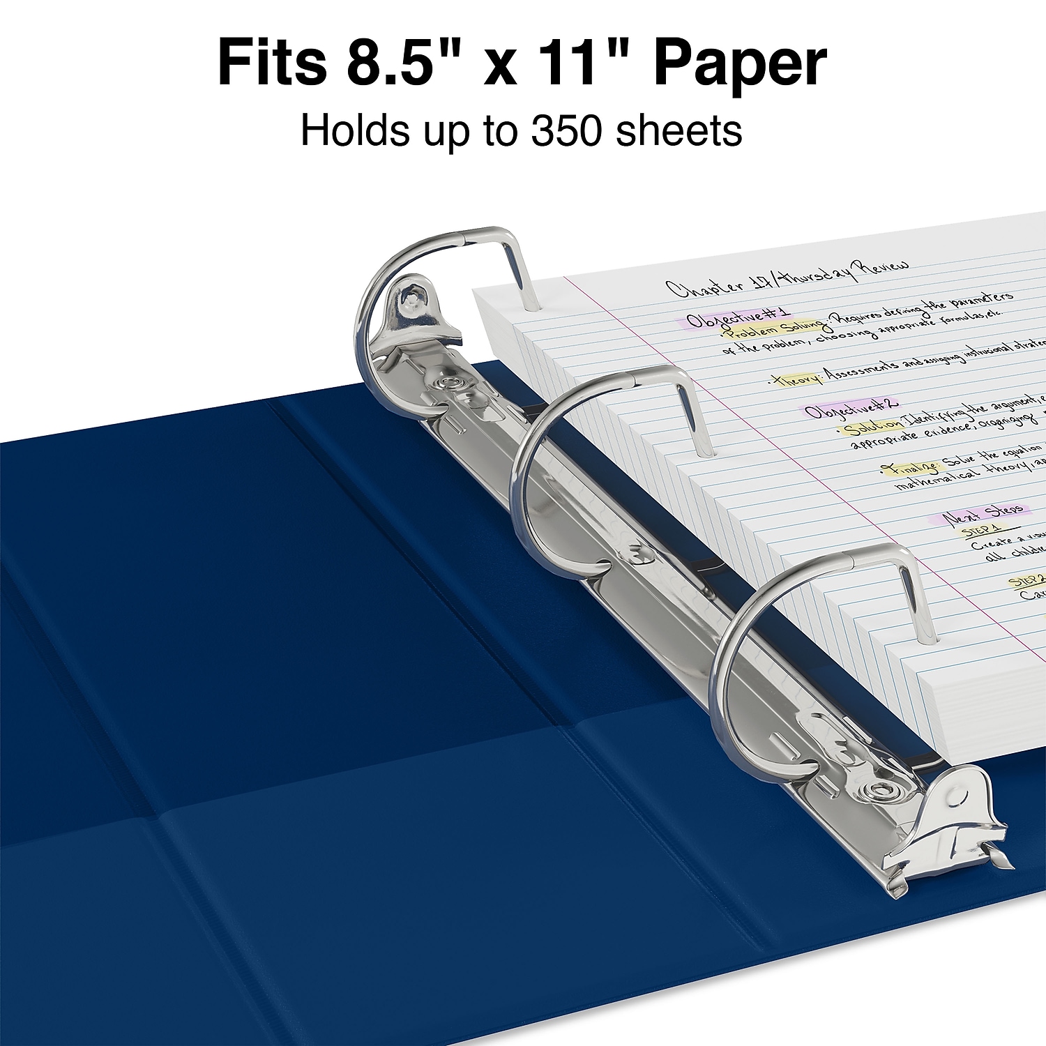 Keep documents safe and readily accessible with this Staples standard 1 1/2-inch D-ring view blue binder.Safely store and access your documents using this Staples standard view blue binder. The 1 1/2-inch D-rings allow pages to lie flat and have a 350-sheet capacity to handle large stacks of papers. Two pockets in the interior deliver additional storage options. This Staples standard binder has wider front and back panels to fully cover standard dividers and sheet protectors. Navy blue view binder is an excellent choice for storing spreadsheets and other wide papers. 1 1/2 inch binder. Three D-rings keep pages secure. Holds up to 350 sheets. Accommodates 8.5" x 11" letter-sized papers. Durable covers are made of plastic. Two interior pockets for added organization. Insert a custom spine label for easy identification. PVC free – made from plastics using fewer harmful chemicals and with reduced emissions during manufacturing. Sold as 1 Each.