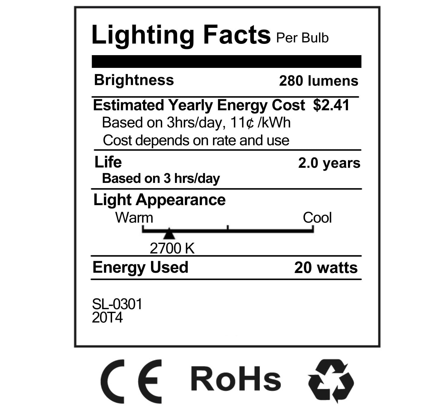 Sterl Lighting pack of 10 of 20 watts T4 JCD type halogen light bulb works with 120 voltage and fits G8 bi-pin base type. This is a clear glass bulb that provides 2700 kelvin warm white lighting with any fixtures, offers CRI 100 that let us see the color vibrance of objects under this light source. It produces 280 lumens of light output and lasts for an average life span of 2000-hours. This energy-saving bulb is commonly used for pendant lights, under-cabinet lights, chandelier replacement bulbs, desk lamp replacement bulb, accent lamp and wall sconces lighting.