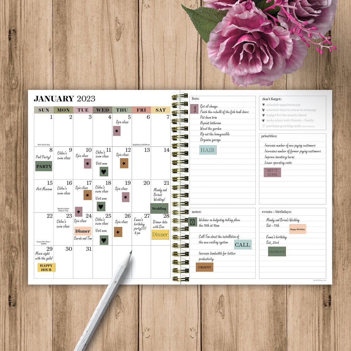 - Boasts monthly, 2-page spreads that include lined sections for notes, tasks, and goals and weekly