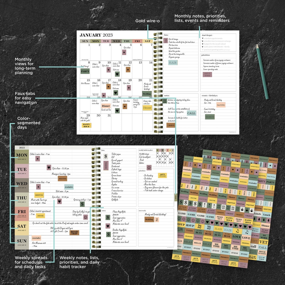 Never miss an appointment with this lovely academic year planner featuring a gentle reminder to make you smile! The interior pages are designed with a classic and refined feel, accented with faux monthly tabs for easy access to weekly planning. Enhance your daily plans with 216 color coordinating stickers to highlight special occasions and personalize your planner. Bonus lined notes pages are in the back with yearly 2022 and 2023 views in the front. Featuring a durable, textured cover and sophisticated, gold wire-o binding designed to lay flat when open, this 12-month planner covers July 2022 – June 2023 and contains no plastic.