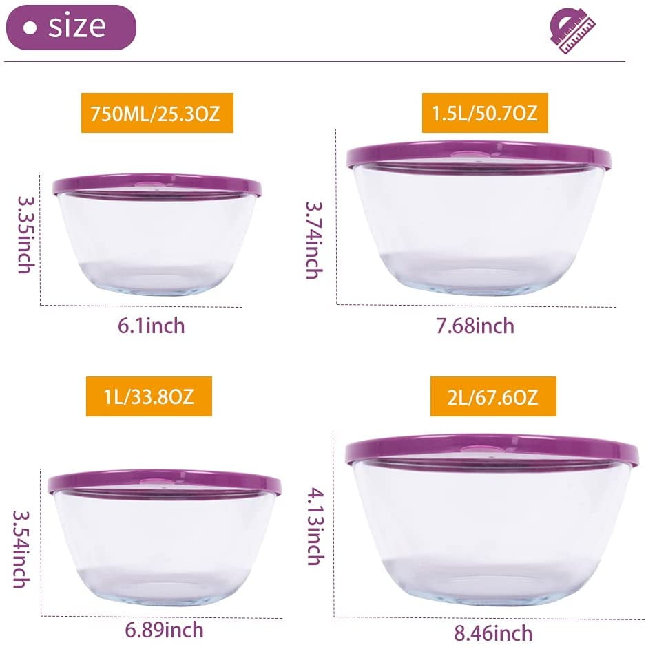 - 4 PACK GLASS BOWLS SET : TIBLEN glass containers include 4 sizes: 1x750ml(26 OZ -3.2 cups),1x1000ml(34 OZ – 4.2 cups) 1x1500ml(51 OZ – 6.4 cups) , 1x2000ml(68 OZ – 8.5 cups) .