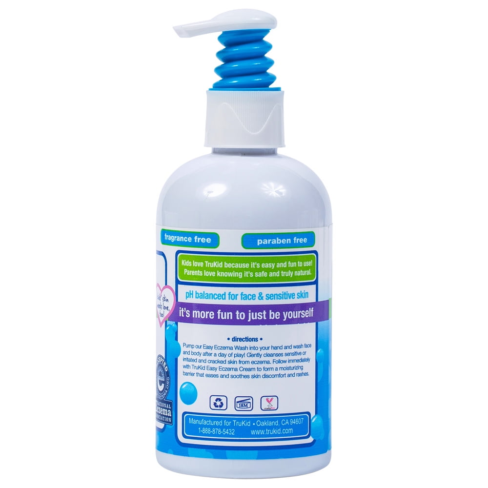 Truly natural eczema face and body wash gently cleanses irritated_and cracked skin caused by eczema. Our moisturizing blend of aloe, calendula, chamomile and borage oil gently cleanses_your face and body without damaging or removing the skins natural moisture barrier. Ideal for most skin types and perfectly gentle_for the entire family. Approved by the National Eczema Association. Pediatrician and dermatologist_tested and approved. Follow immediately with TruKid Easy Eczema Cream to form a moisturizing barrier that eases and soothes skin discomfort_and rashes.TruKid Eczema Soothing Face and Body Wash, Unscented, 8 Oz