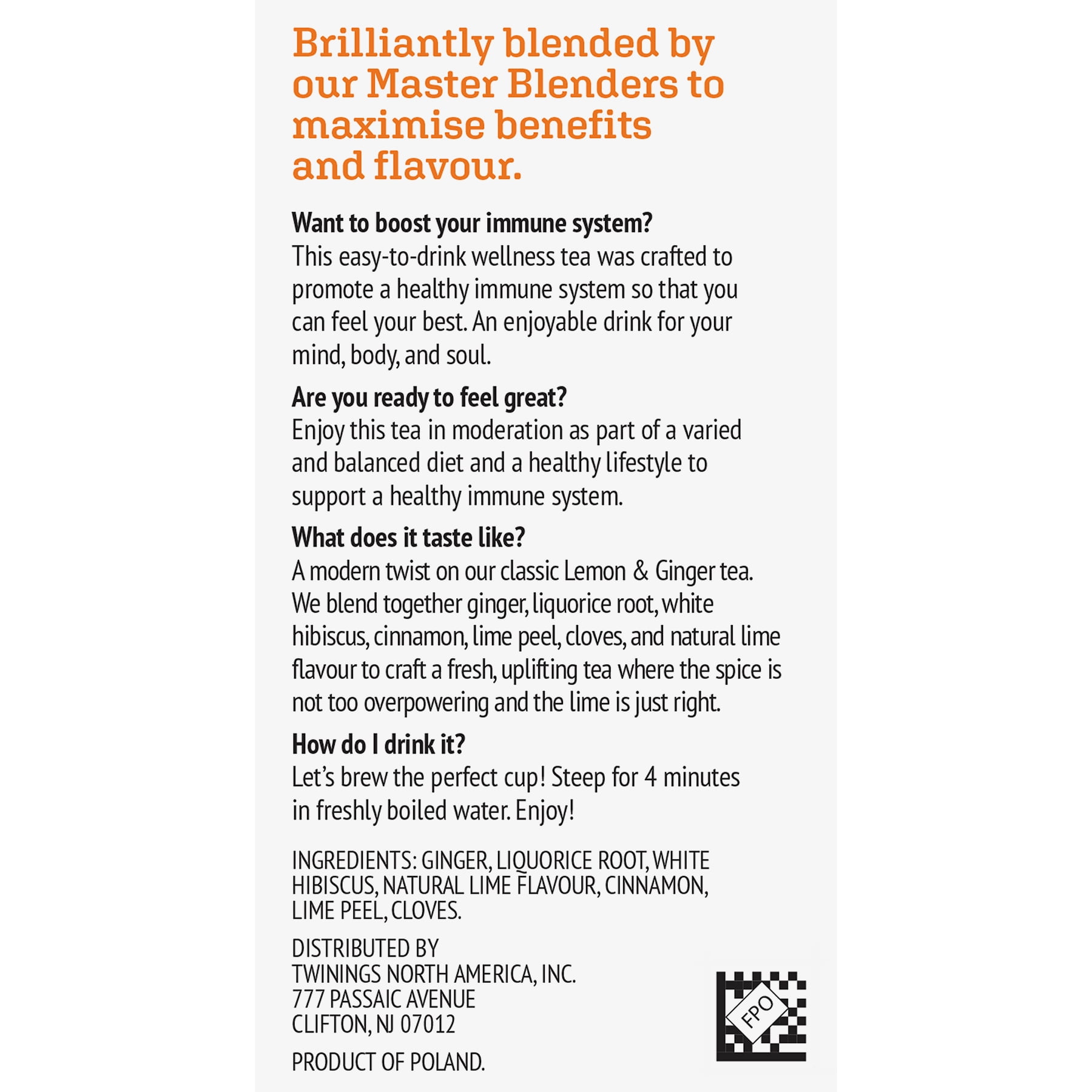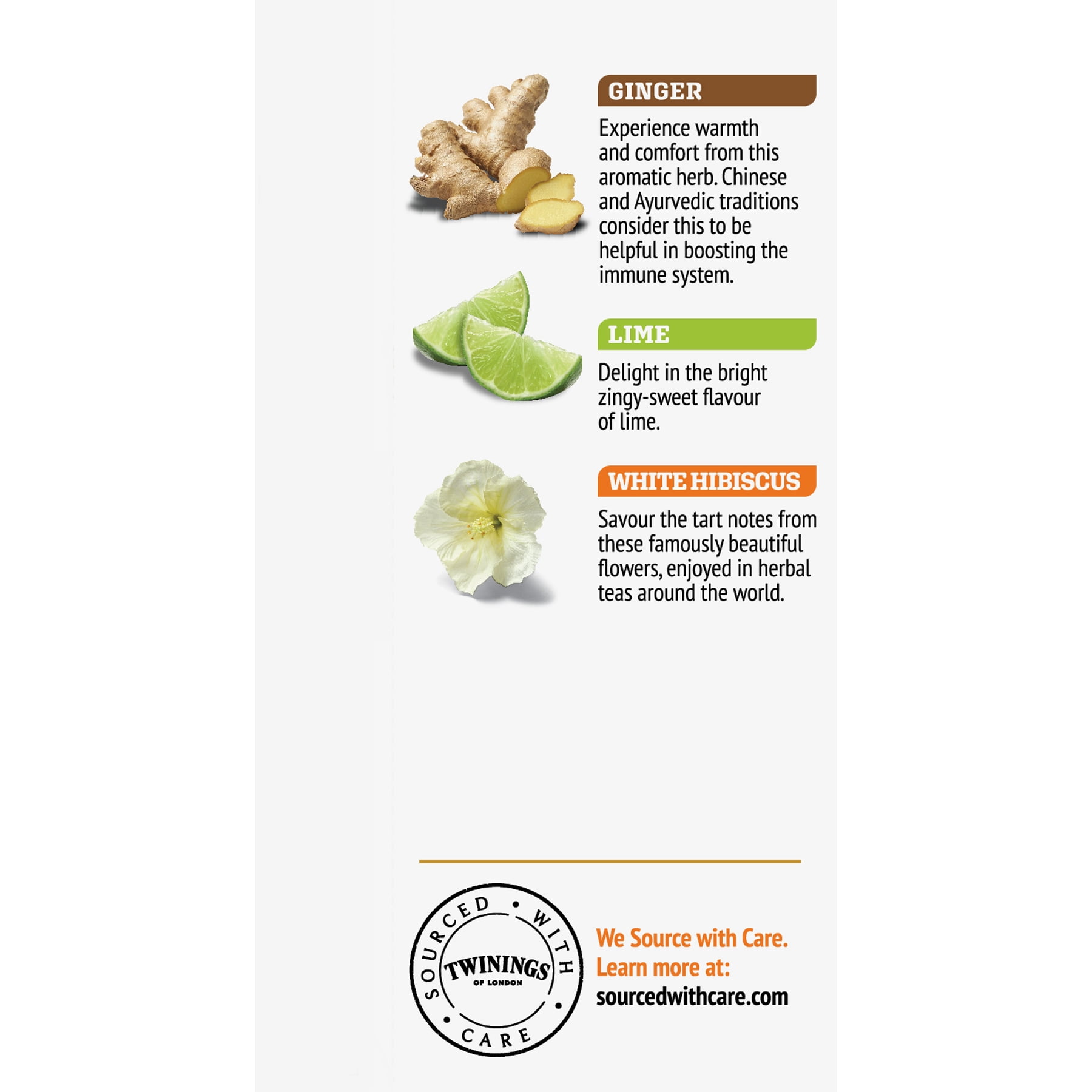 - DRINK IN LIFE: a box of 18 Supportive Ginger Lime & Ginger Flavoured Herbal Tea bags Caffeine-Free, by Twinings London