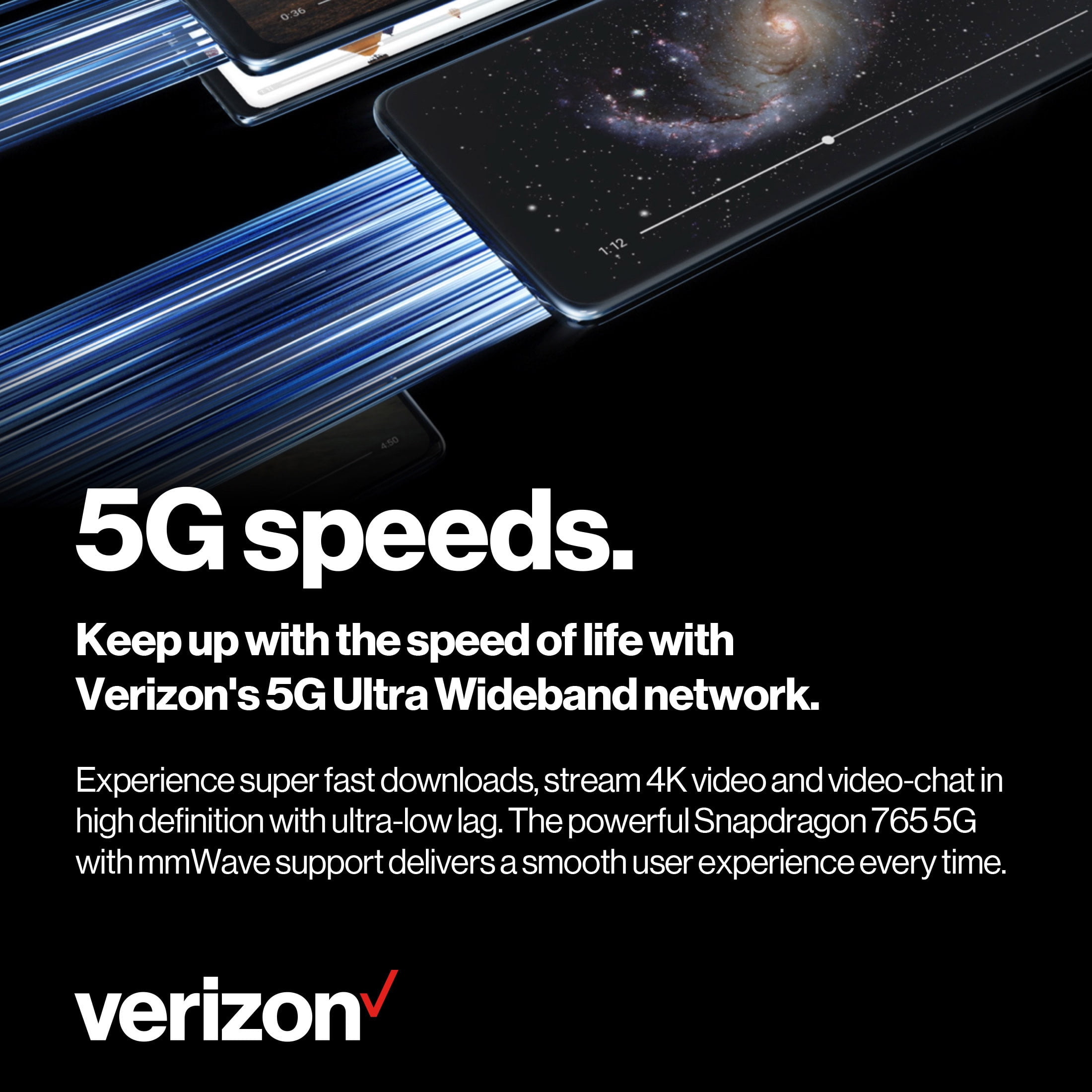 - 5 G Speeds – Keep up with the speed of life with Verizon’s 5G Ultra Wideband network.1 Experience super fast downloads, stream 4K video and video-chat in high definition with ultra-low lag. The powerful Snapdragon 765 5G with mmWave support delivers a smooth user experience every time.