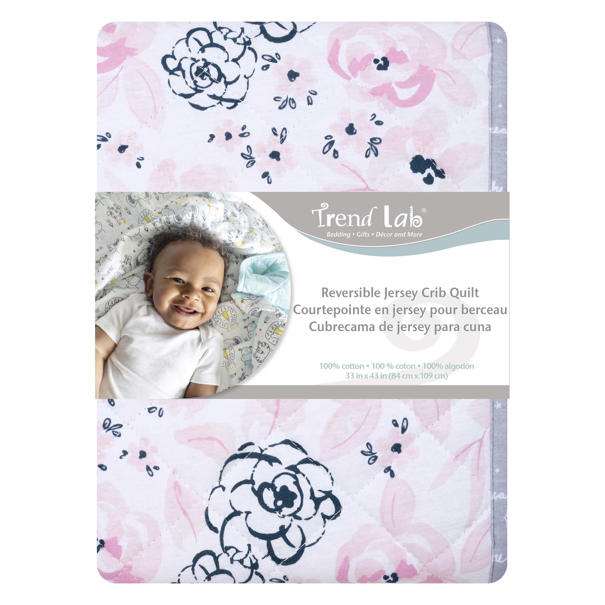 The Trend Lab Watercolor Floral Quilted 100% combed cotton Jersey Blanket offers the perfect amount of breathable warmth and softness to keep baby nice and cozy. This large reversible soft cotton jersey blanket is lightly quilted and features a lovely watercolor floral print in soft pink and navy blue on a white background. The opposite side features ?little dreamer? and ?I love you to the moon? script writing alongside moons and stars in white on a dove gray background. Our multipurpose jersey blankets are generously oversized measuring 33 in x 43 in and are perfect for swaddling, tummy time and on-the-go nursing coverage! Additional colors, prints and jersey products by Trend Lab are sold separately.Watercolor Floral Quilted Jersey Baby Blanket