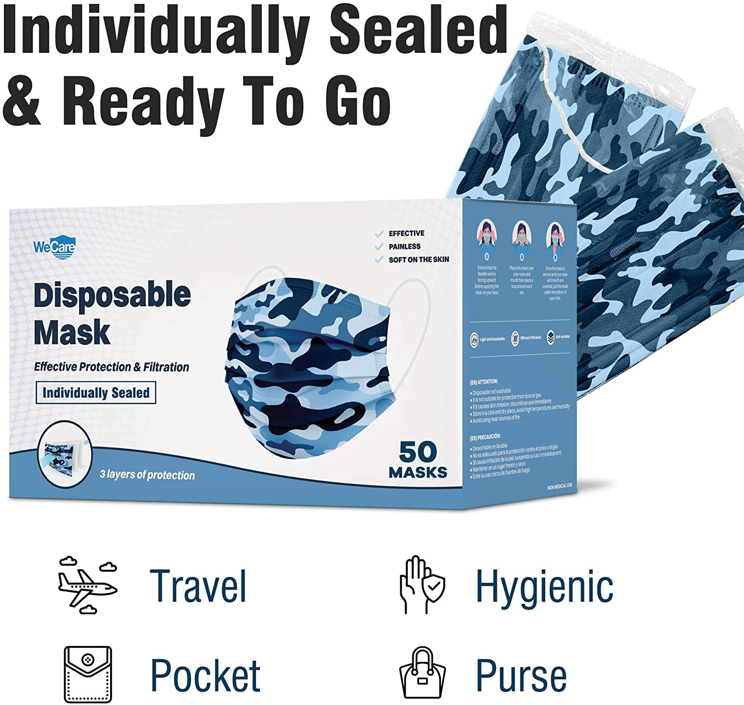 WeCare’s 3 Ply Face Masks are as comfortable as a face mask gets! Each mask is individually wrapped and sealed, so you can carry them around in your bag, purse or even pocket while maintaining hygiene and cleanliness. These masks are designed to be pain free and comfortable. The fabric is soft and gentle on your skin, and the filter is high density and effective. *This is a disposable general use face mask that is not intended for use in a medical or clinical setting. Integrated anti-fog nose pad. Latex-free and filter without micro-glass. Produced in ISO 8 clean room. Main material is 3 layers of blown filtering fabric; Laces and edges made of very soft non-woven polypropylene. Parts of body contacted by mask: Face, cheeks, mouth, nose and ears. To report any adverse events please contact our team at 1-866-603-0638.
