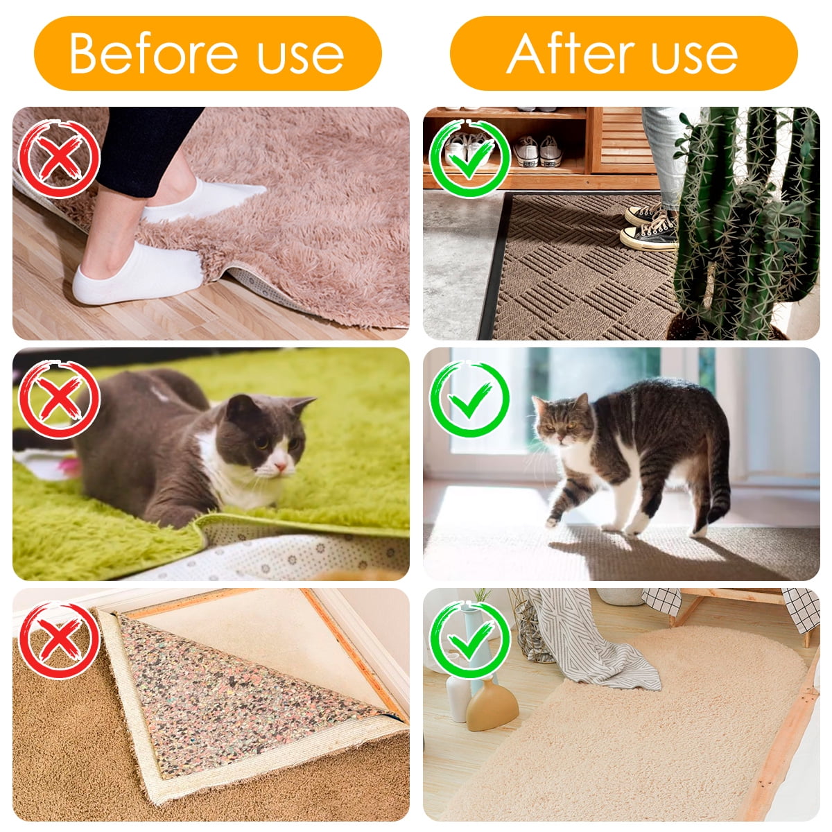 - 【Easy to Install and Use】Before using or reusing carpet tape, please make sure that the floor and carpet are clean and dry; then tear off the plastic covering on the smooth surface of the non-slip carpet gripper, and stick the smooth side to the carpet; finally, Tear off the covering on the holey side, stick one side and press it on the floor.
