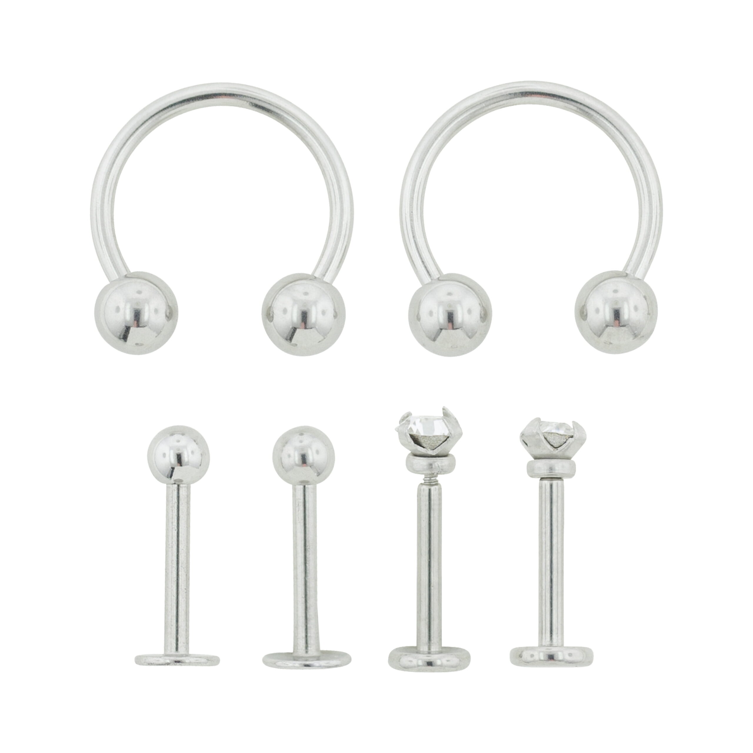 This stylish set of classic 16 gauge body jewelry will cover all your piercing needs, and is especially great for those with "snake bite" or other double lip piercings! Set includes one pair of labret studs with plain 3MM ball beads, one pair of labret studs with clear prong-set crystal top beads, and one pair of horseshoes with plain 4MM ball beads. Each piece is precision crafted from surgical quality material.
