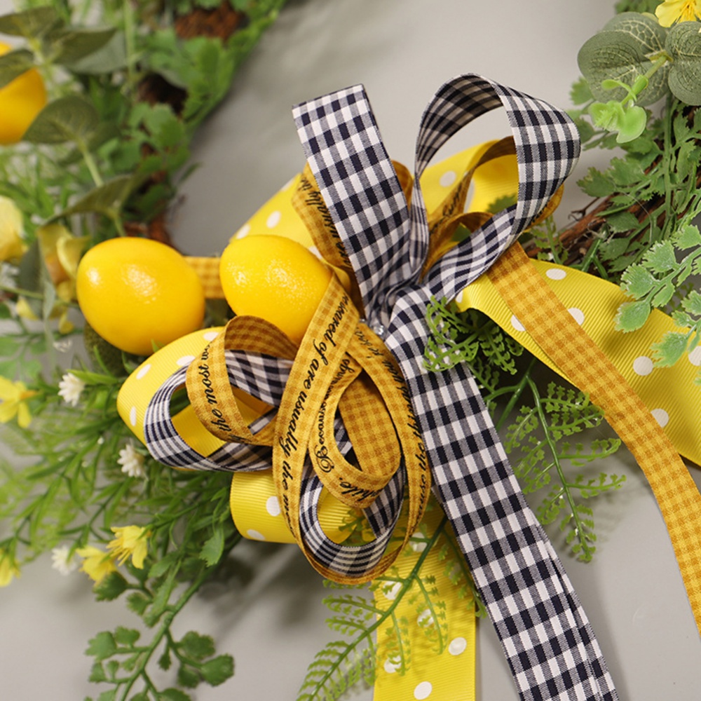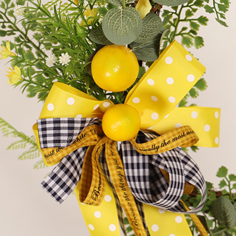 - 2, Design: mainly use elegant handmade lemon garlands, yellow lemons, and small flowers of various colors and white hydrangea, green leaves, yellow wildflowers are distributed throughout the wreath, decorated with black and white brown plaid bows, creating a lively scene, the garland is full of life.