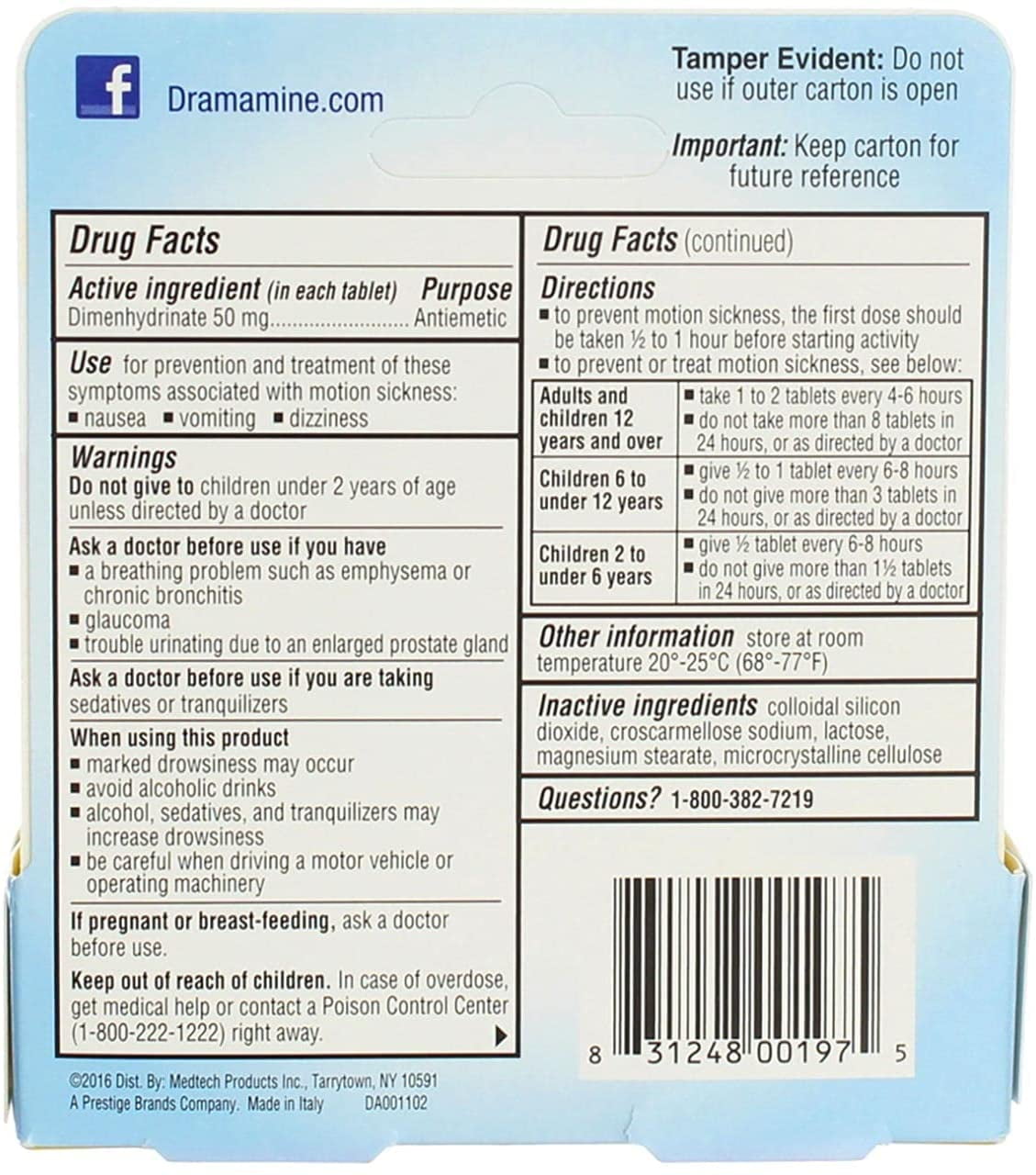 BONINE® TABLETS: A chewable once daily tablet for adults that helps prevent and treat nausea, vomiting or dizziness associated with motion sickness. Take Bonine® Tablets one hour before travel for 24 hours of motion sickness relief. This fruity raspberry tablet is just what your travel medicine kit is missing. Find nausea relief in an easy chewable form, with less drowsiness than other leading brands of antiemetic tablets. Just about anyone can get motion sickness. Kids ages 2-12 get it very easily, while infants and toddlers seem relatively immune. But for everyone else, riding in a car, boat, train or plane can bring on unsettling feelings of nausea and dizziness.Taking Bonine® right before you travel can help keep motion sickness at bay. Count of 8 tablets per package.
