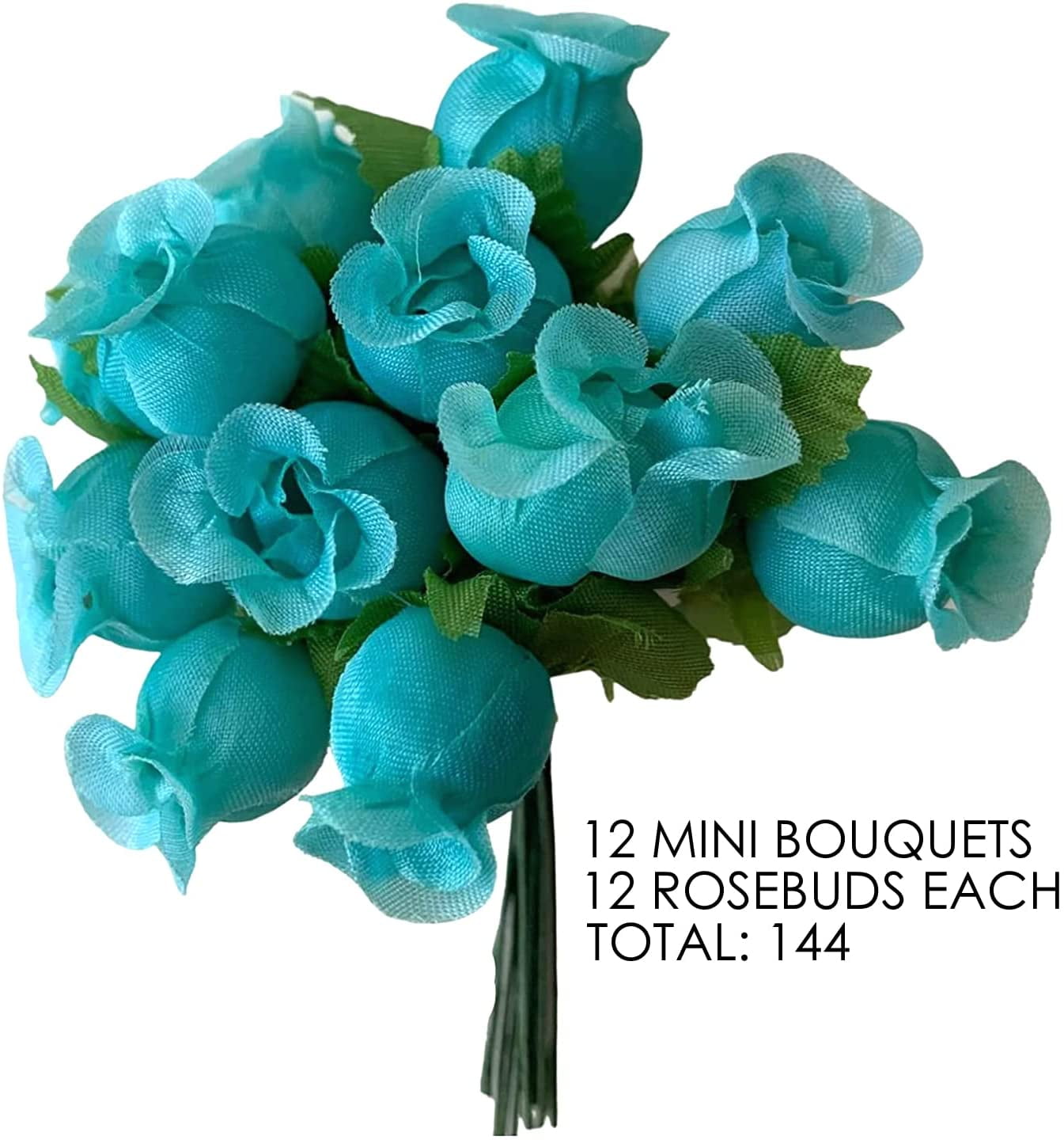 - 12 faux silk polyester Aqua Artificial Rosebuds mini bouquets, with 3" long, bendable green stems and leaves for all your Arts, Crafts and DIY needs