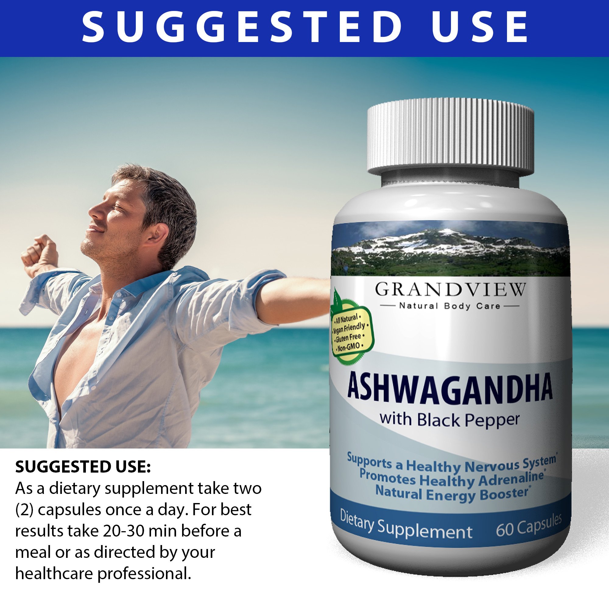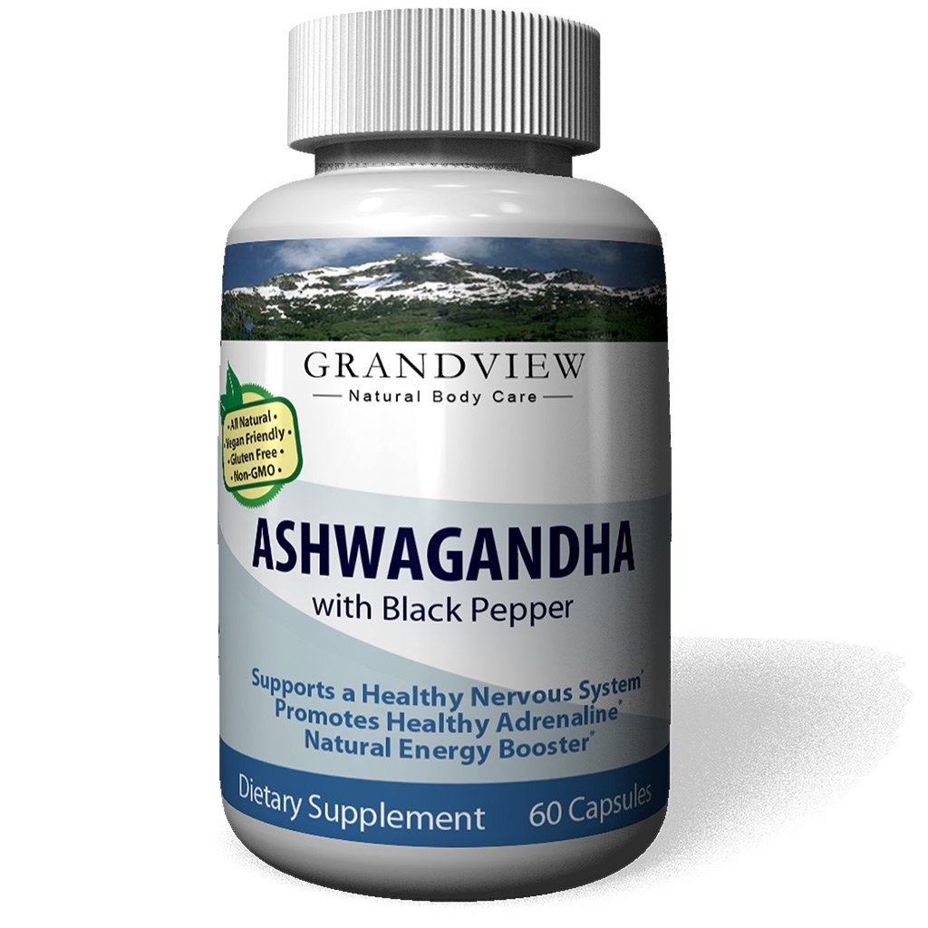 Ingredients:Ashwagandha, Black PepperAll Grandview Natural Body Care supplements are manufactured and packaged in an FDA-approved facility and follow stringent GMP guidelines. Third Party Tested for quality and purity.Supports A Healthy Nervous System Helps Reduce Stress Elevates Mood Boosts Energy Levels Helps Protect the Immune System with Black Pepper