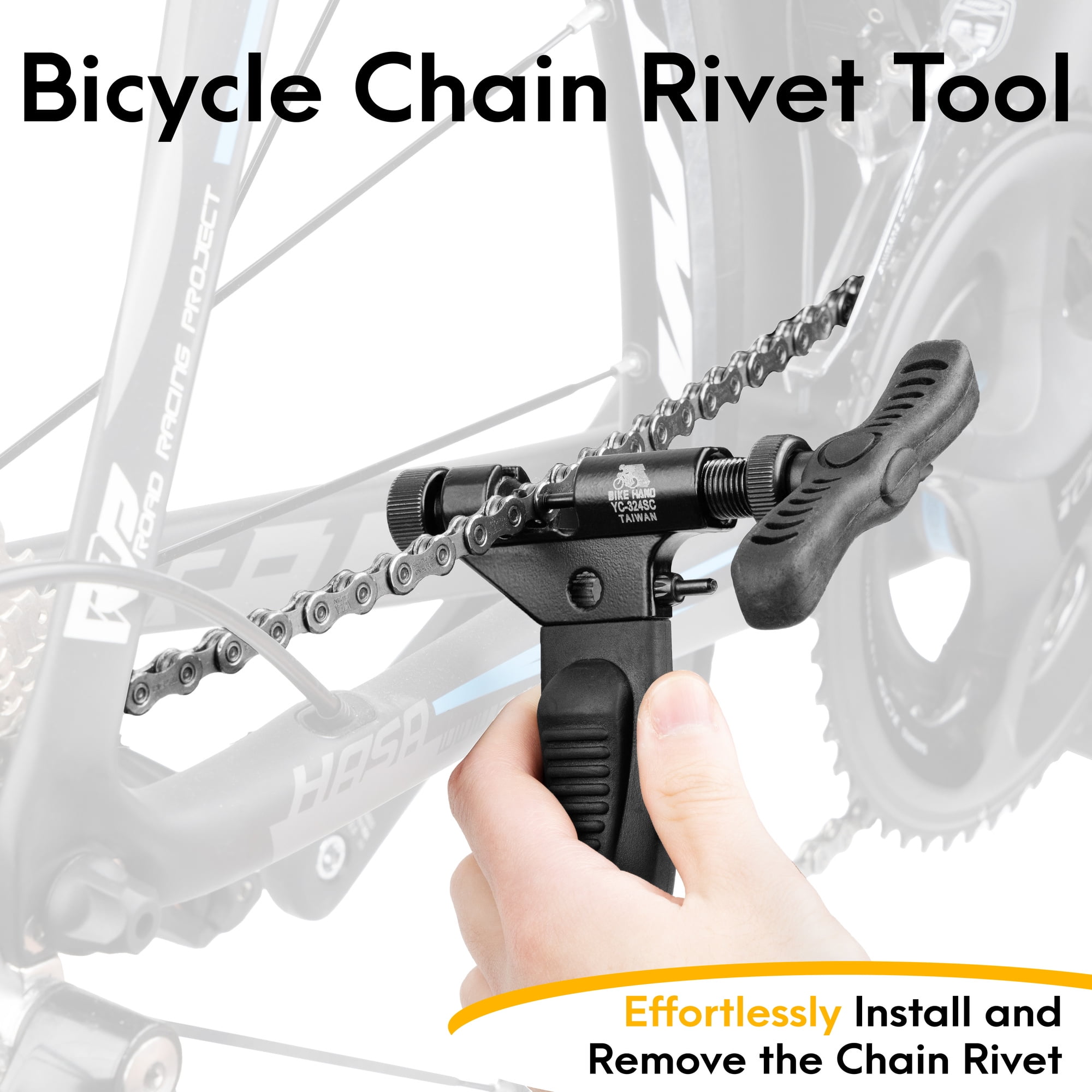 CHAIN RIVET TOOL: A professional tool that can effortlessly install and remove the chain rivet without damaging the chain, features a spare driving pin. The precision-designed pin screws into the chain, with an adjustable clamp that suits chains of various widths, and a steel-constructed body with a contoured cushioned handle. Compatible with any bicycle chain, from a single speed up to 12 Speed and half-link single-speed chains.