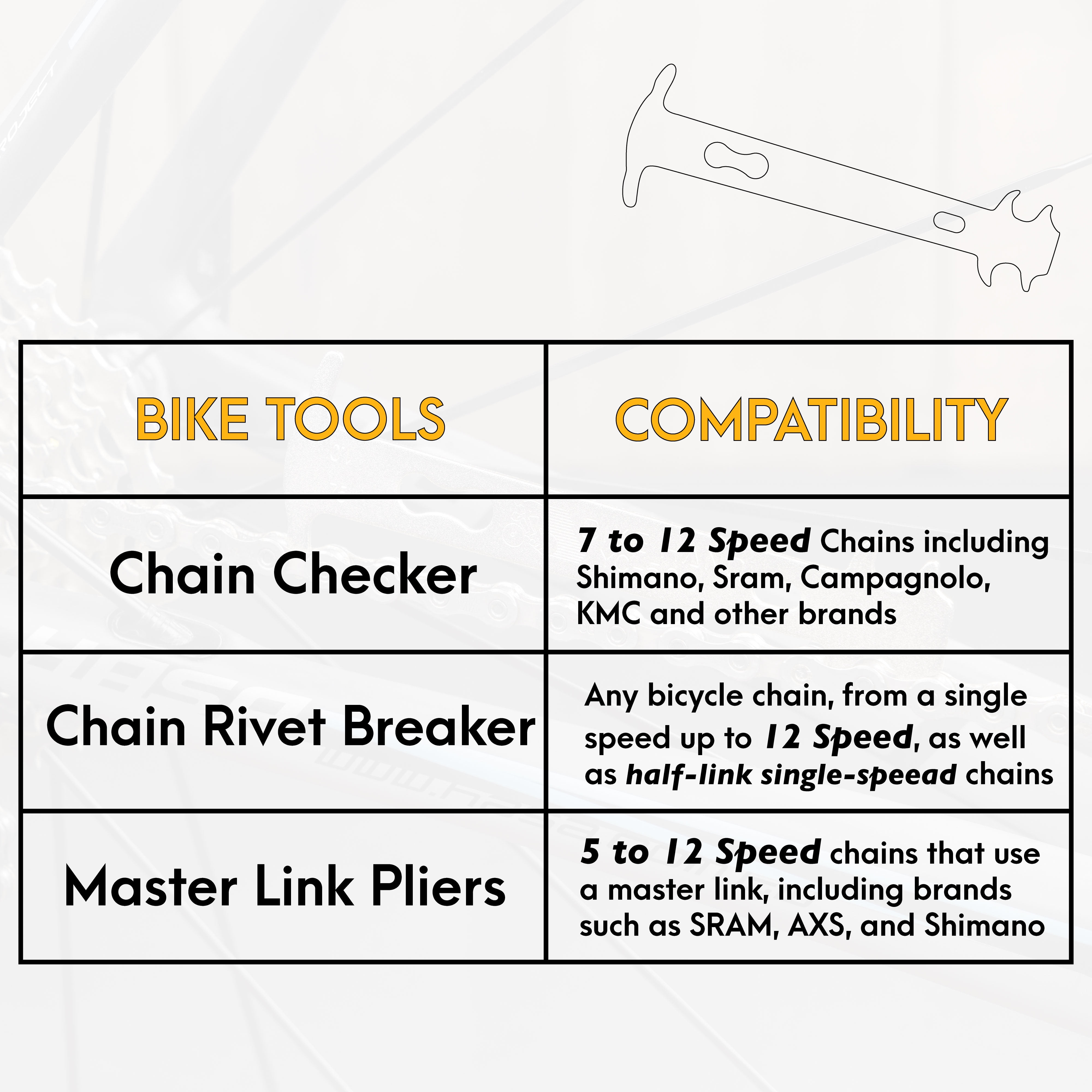 CHAIN CHECKER: This precision laser-cut chain checker is designed to accurately measure when the chain reaches a .75% or 1.0% stretch and decide the necessity of chain replacement. Place the checkers onto a segment of the chain then see whether the chain checker lies completely flat on the chain. If so, replace the chain. Compatible with 7 to 12 Speed Chains including Shimano Sram Campagnolo KMC and other brands.